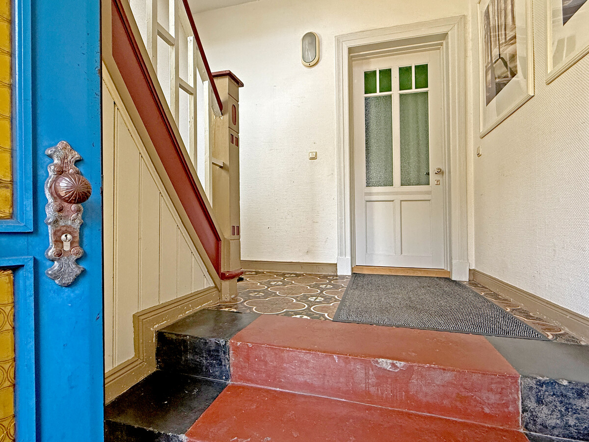 Der Zugang erfolgt über ein klassisches Treppenhaus, das den zeittypischen Eindruck des Hauses stimmig fortführt. Ein Keller ist vorhanden und ergänzt die Wohnung um praktische Abstellmöglichkeiten.