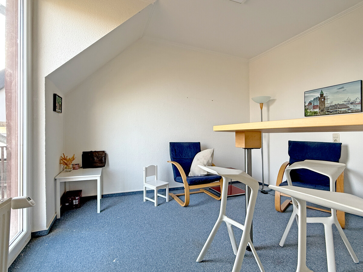 Der Wohnbereich präsentiert sich hell und gut möblierbar, mit großzügigen Fensterflächen für eine freundliche Tageslichtstimmung. Die klare Geometrie des Raumes erleichtert eine effiziente Flächennutzung und spricht damit auch langfristige Wohnkonzepte an.