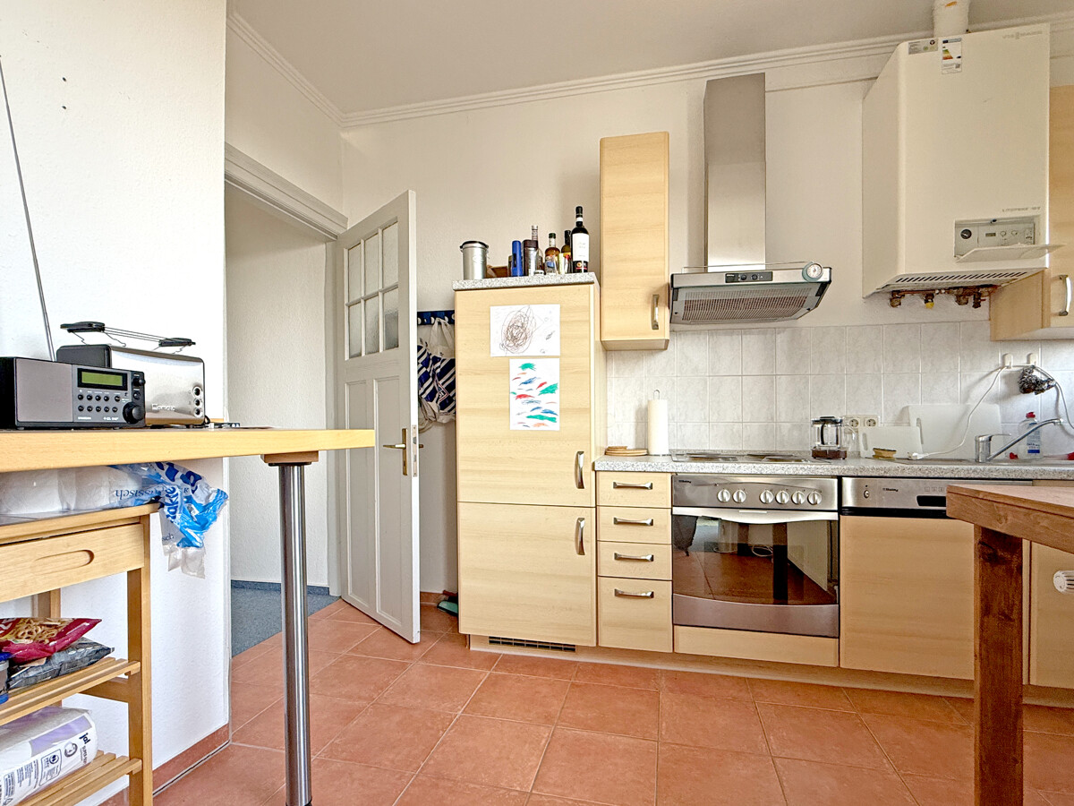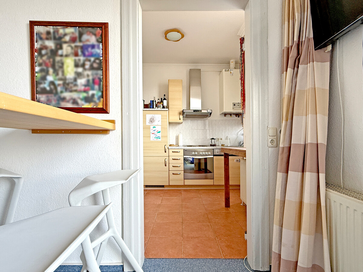 Die Küche ist als separater Raum angelegt und wirkt durch die helle Gestaltung funktional und aufgeräumt. Der Fliesenboden unterstreicht den praktischen Charakter dieses Bereichs.