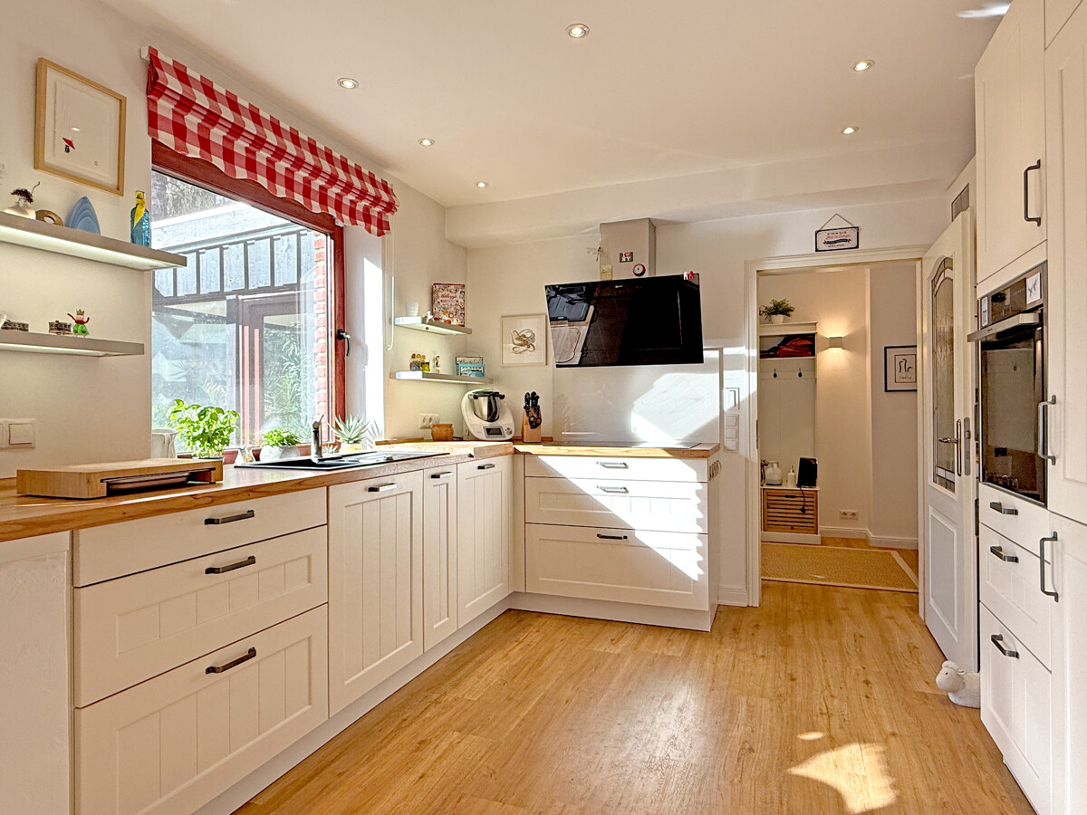 Die Einbauküche mit Einbaugeräten präsentiert sich funktional und zugleich einladend – ein Ort, der sowohl im Alltag als auch bei geselligen Kochabenden überzeugt. Ein großzügiger Hauswirtschaftsraum ergänzt das Raumangebot sinnvoll und sorgt für zusätzlichen Stauraum sowie praktische Arbeitsflächen im Alltag.