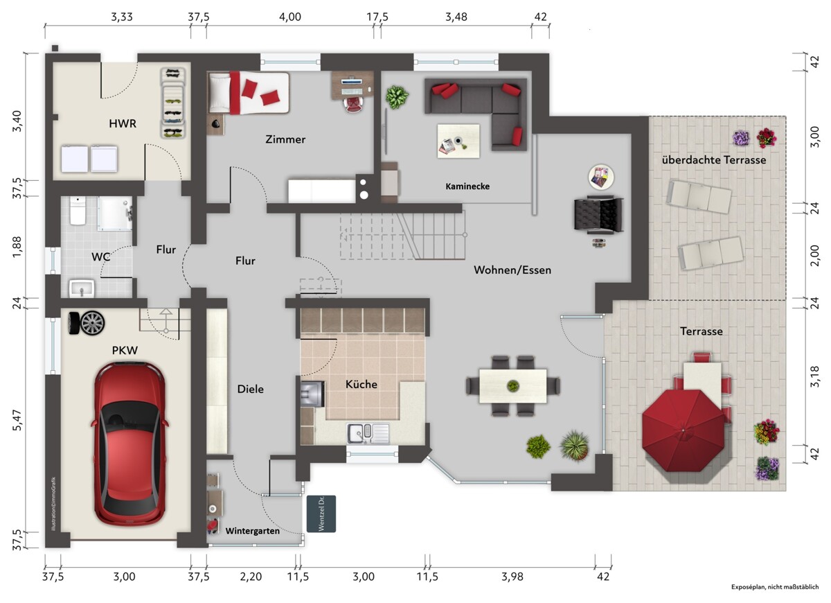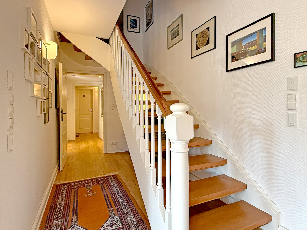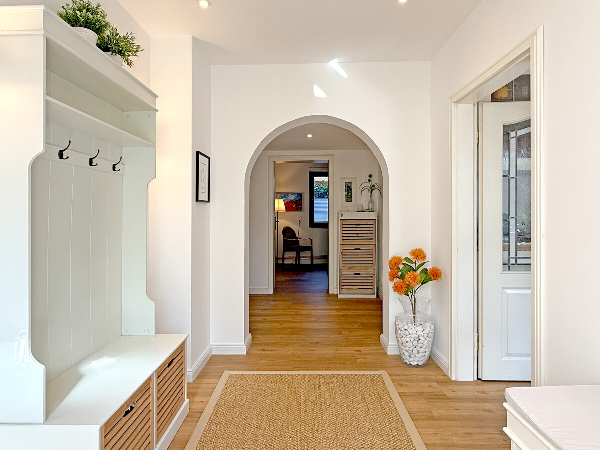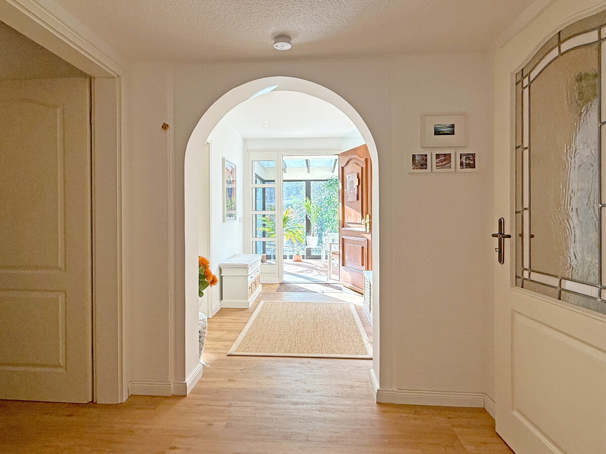 Der Zugang zum Haus erfolgt über den lichtdurchfluteten Wintergarten, der bereits beim Eintreten eine besondere Atmosphäre schafft. Von hier aus gelangen Sie in den freundlichen Eingangsbereich, von dem sich die zentralen Wohnbereiche harmonisch erschließen.