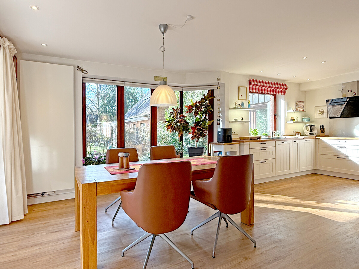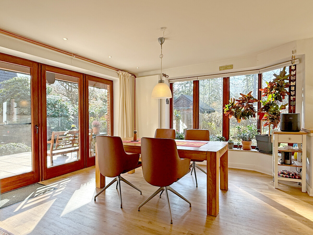 Der großzügige Wohn- und Essbereich bildet das Herzstück des Hauses. Große Fensterflächen durchfluten die Räume mit Tageslicht und schaffen eine warme, einladende Atmosphäre. Der Übergang zur Terrasse und in den Garten ist fließend und unterstreicht das offene Wohngefühl. Eine große, teilweise überdachte Süd-Terrasse, bietet zusätzliche Möglichkeiten für entspannte Stunden im Freien.