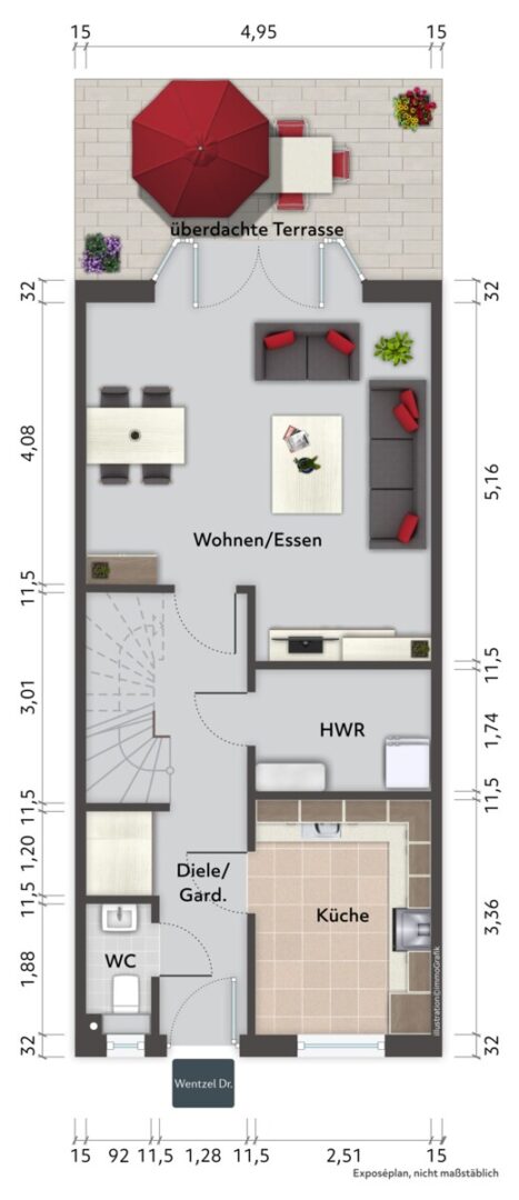 Der Gartenbereich ist blickdicht angelegt und präsentiert sich als klar geschnittene Fläche mit Platz für Spiel, Rückzug und entspannte Stunden im Freien. Die überdachte Terrasse mit Südausrichtung ist mit einer Markise zur Beschattung und LED-Spots ausgestattet. Diese Immobilie bietet modernes und zeitgemäßes Wohnen in einer familienfreundlichen Umgebung.