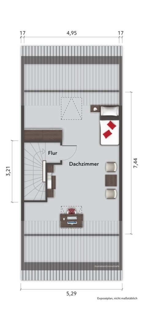 Das ausgebaute Dachgeschoss bietet zusätzliche Nutzungsmöglichkeiten, etwa als Schlaf-, Arbeits-, Gästezimmer oder Hobbyraum.