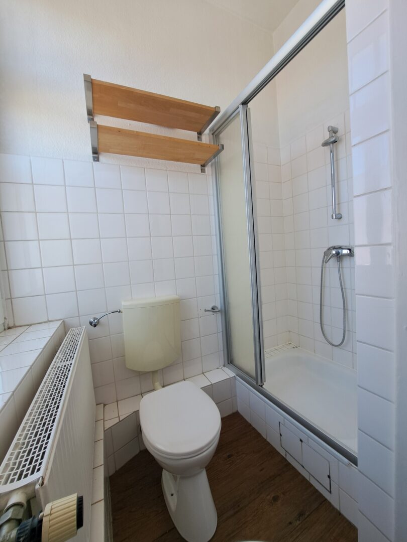 Das Tageslichtbad ist weiß gefliest und mit einer Dusche ausgestattet.