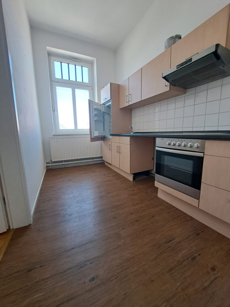 Die Küche verfügt über eine Einbauküche inklusive Kühlschrank und bietet zusätzlich ausreichend Platz für eine Waschmaschine.