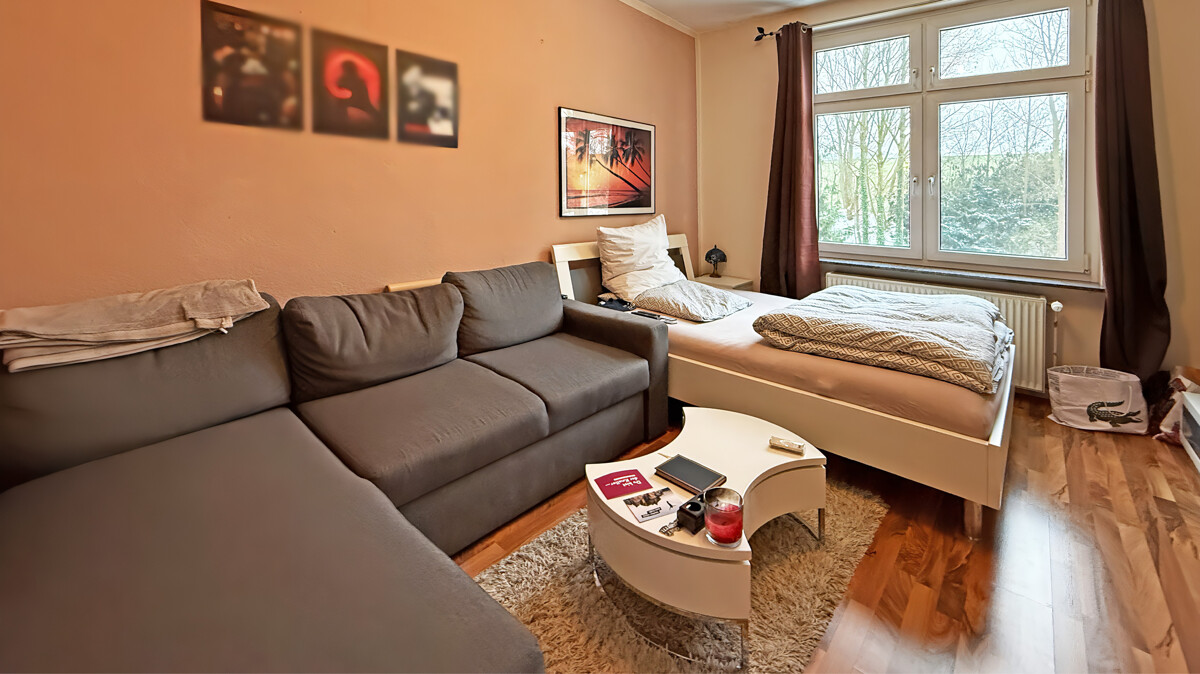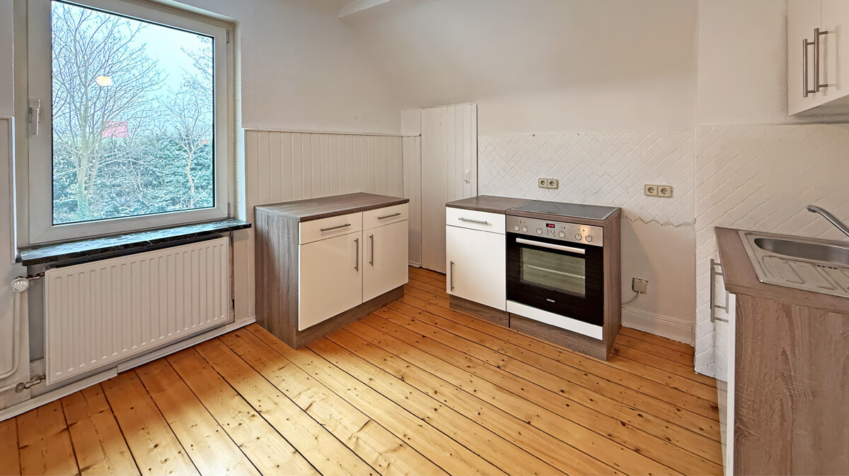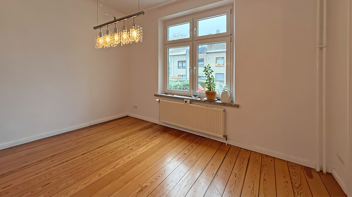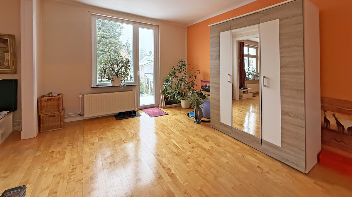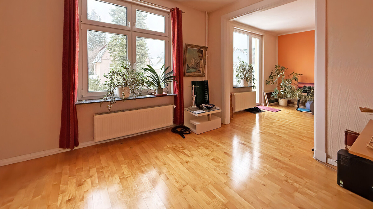 Bereits beim Betreten des Hauses wird der besondere Charakter dieser Villa spürbar. Das Herzstück des Erdgeschosses bildet der ca. 35 m² große Wohn- und Essbereich mit gemütlichem Erker, der für eine helle und einladende Atmosphäre sorgt. Hier lassen sich gesellige Abende mit Familie und Freunden in stilvollem Ambiente genießen. Die geschlossene Küche ist mit einer kleinen Einbauküchenzeile ausgestattet und bietet zusätzlich Platz für einen Essbereich. Von hier aus führt eine Treppe direkt in den Garten – ideal für den schnellen Zugang ins Grüne oder für gesellige Stunden auf der Terrasse. Ein weiteres Zimmer, das sich hervorragend als Schlaf-, Gäste- oder Arbeitszimmer eignet, sowie ein Gäste-WC komplettieren das Raumangebot auf dieser Ebene.