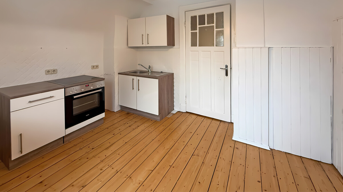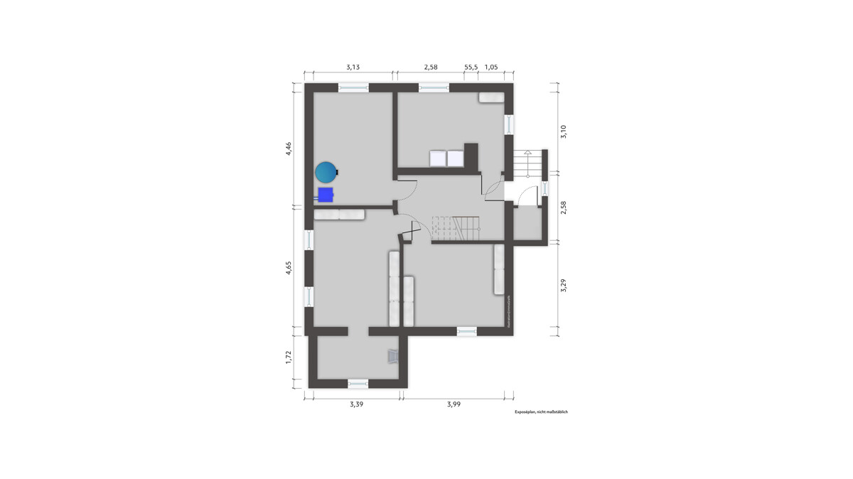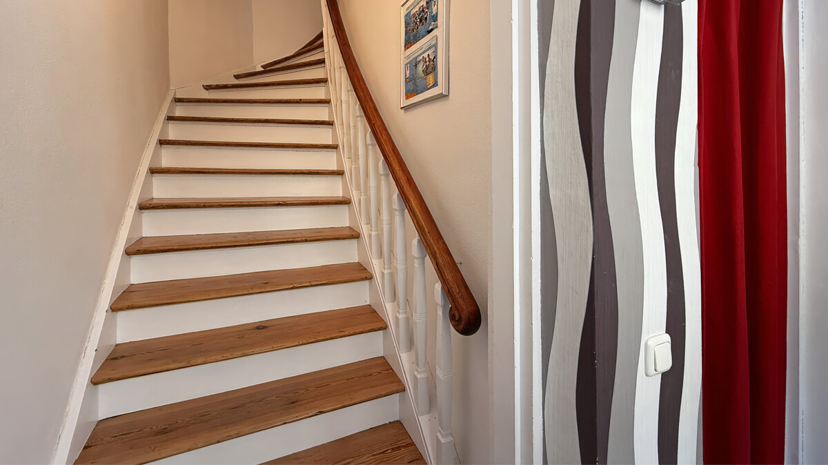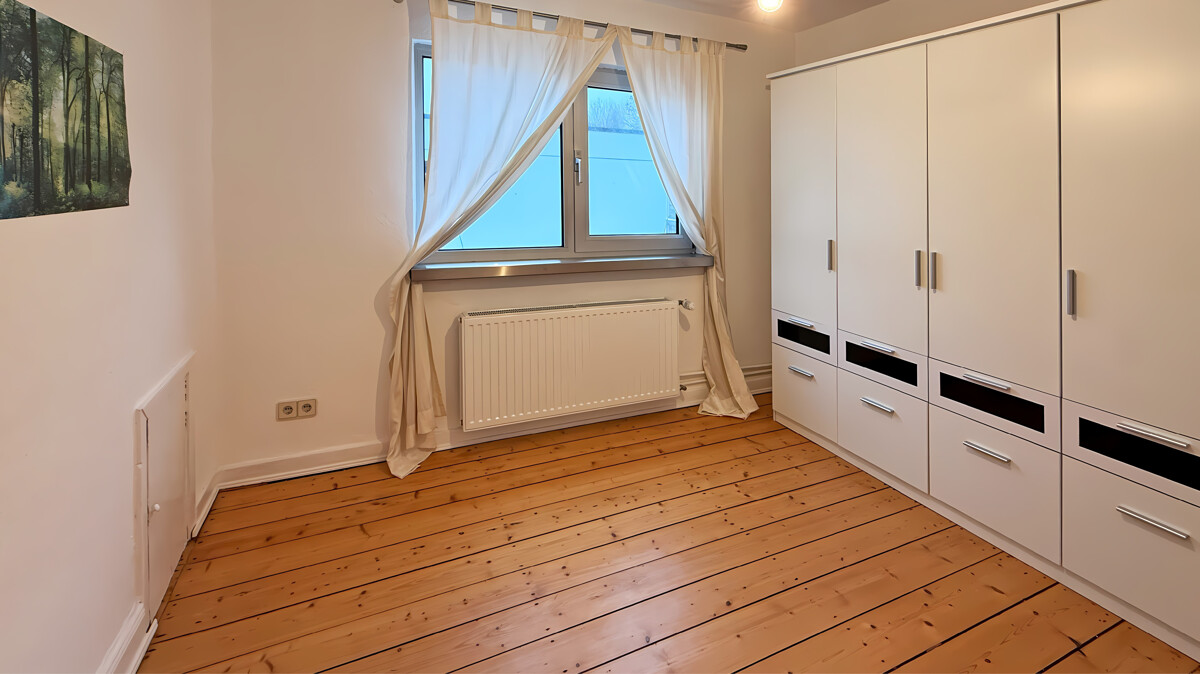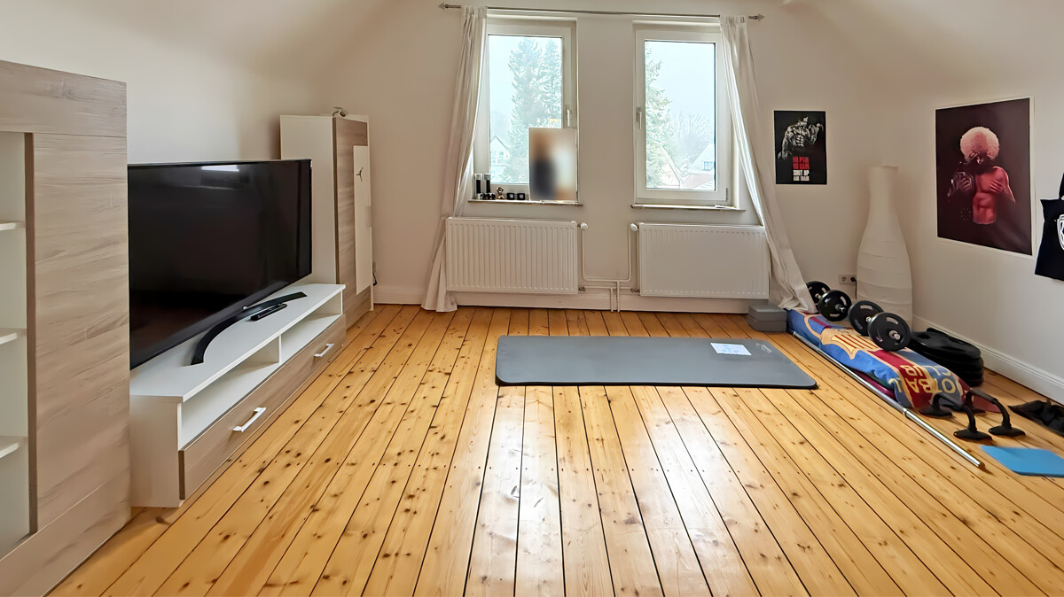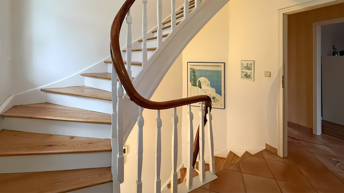 Über eine stilvolle Holztreppe gelangen Sie in das 1. Obergeschoss. Hier erwarten Sie drei weitere Zimmer. Besonders hervorzuheben ist der großzügige Raum mit ca. 30 m² Wohnfläche, der bei Bedarf geteilt werden kann, sodass ein zusätzliches Zimmer entsteht. Von hier aus haben Sie Zugang zu einem Balkon – ein wunderbarer Rückzugsort für entspannte Momente. Ein helles Vollbad mit Fenster sorgt auf dieser Etage für zusätzlichen Komfort.