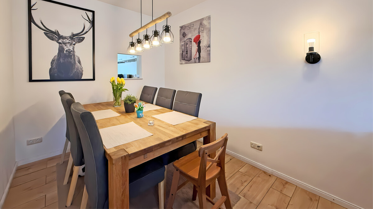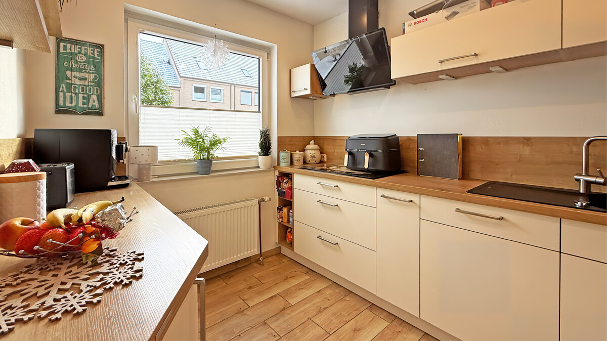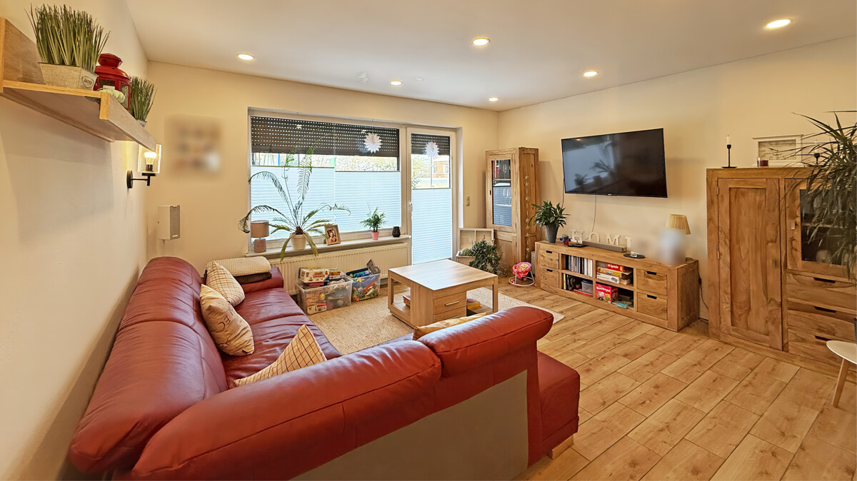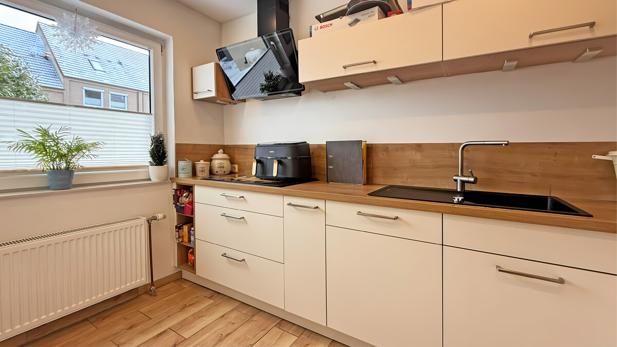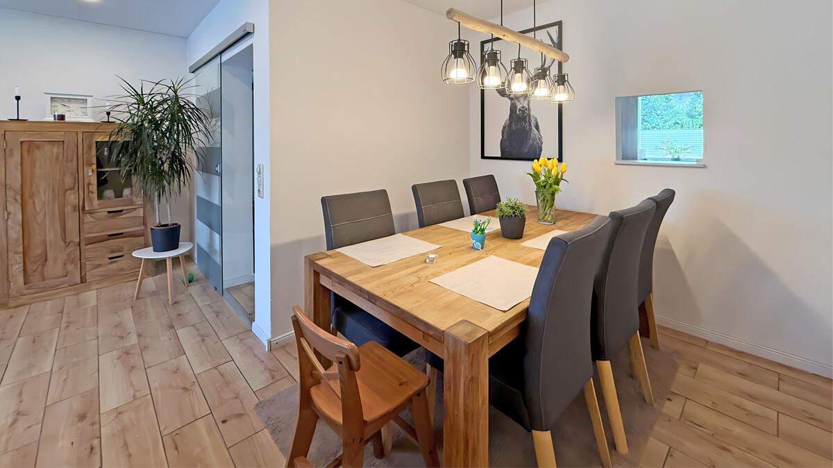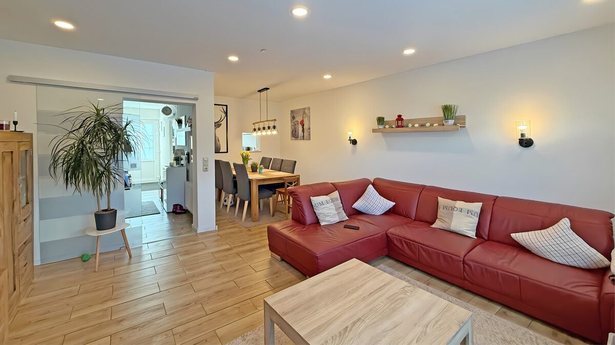 Das Erdgeschoss empfängt Sie mit einer geschlossenen Küche, die mit einer modernen Einbauküche der Marke Nolte Küchen aus dem Jahr 2021 ausgestattet ist. Die praktische Durchreiche verbindet Küche und Essbereich auf charmante Weise und sorgt für kurze Wege im Alltag. Ein Gäste-WC sowie der helle Wohn- und Essbereich schließen sich an. Von hier aus gelangen Sie direkt auf die Terrasse und in den Garten – ideal für entspannte Stunden im Freien, Grillabende oder spielende Kinder.