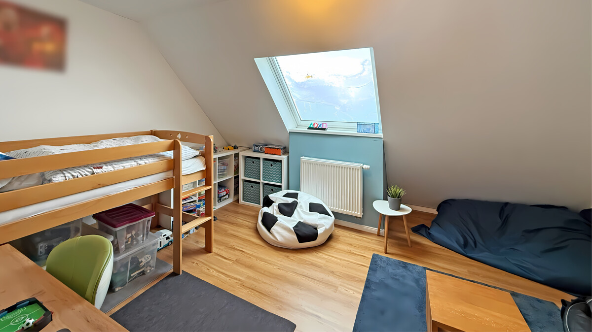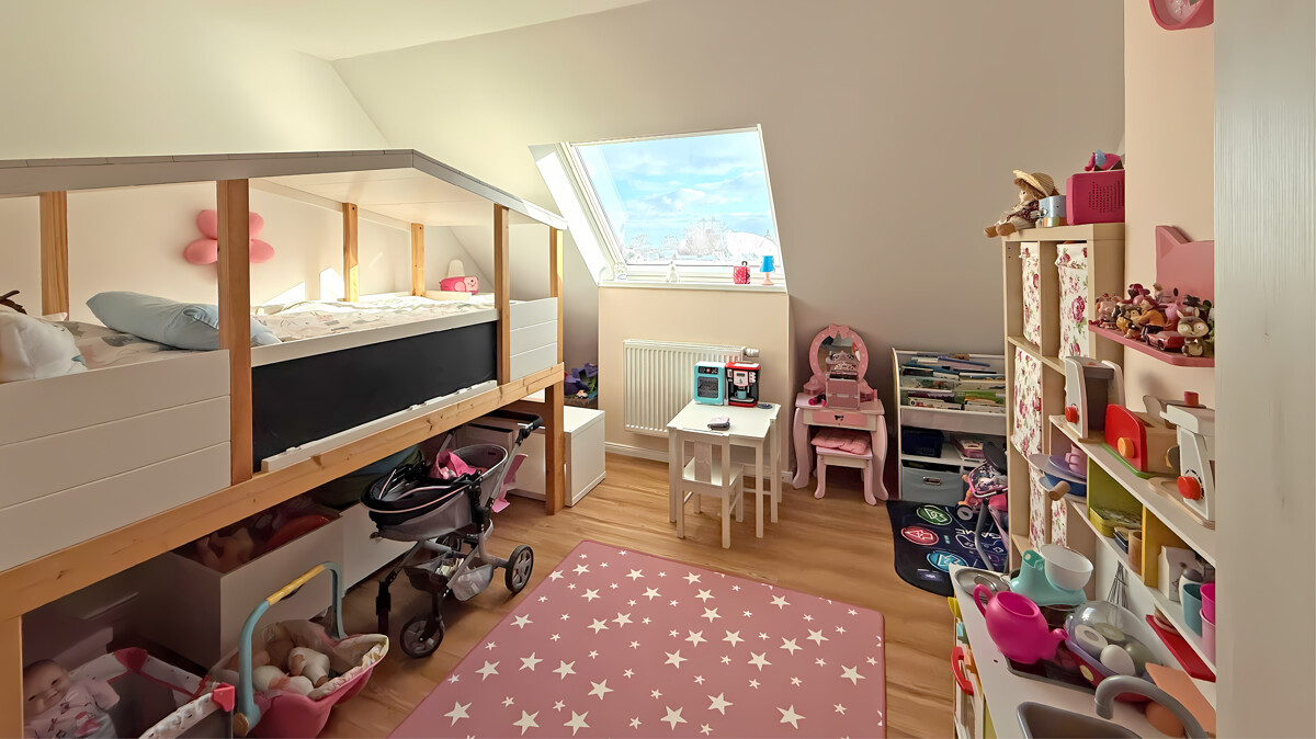 Das nachträglich zu wohnlichen Zwecken ausgebaute Dachgeschoss (weiterhin als Nutzfläche deklariert) beherbergt zwei Räume, die aktuell als Kinderzimmer genutzt werden. Diese Ebene schafft wertvolle zusätzliche Fläche und vielfältige Nutzungsmöglichkeiten.