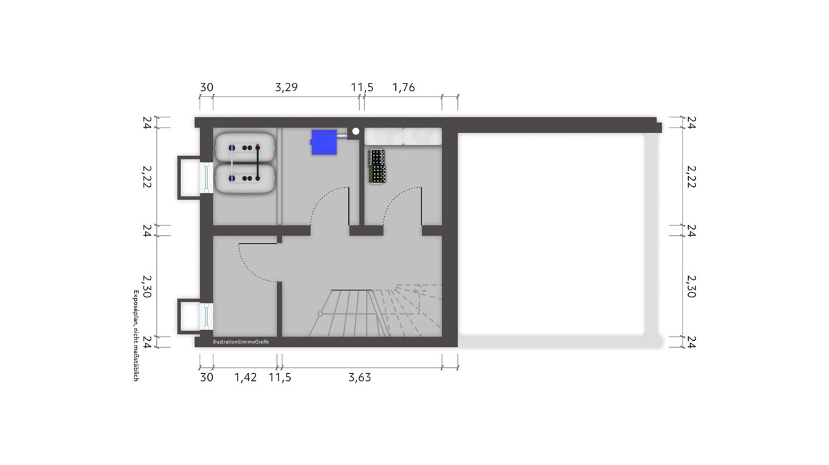 Die Immobilie ist teilunterkellert. Im Kellerbereich zeigt sich Feuchtigkeit, was bei der weiteren Planung berücksichtigt werden sollte.