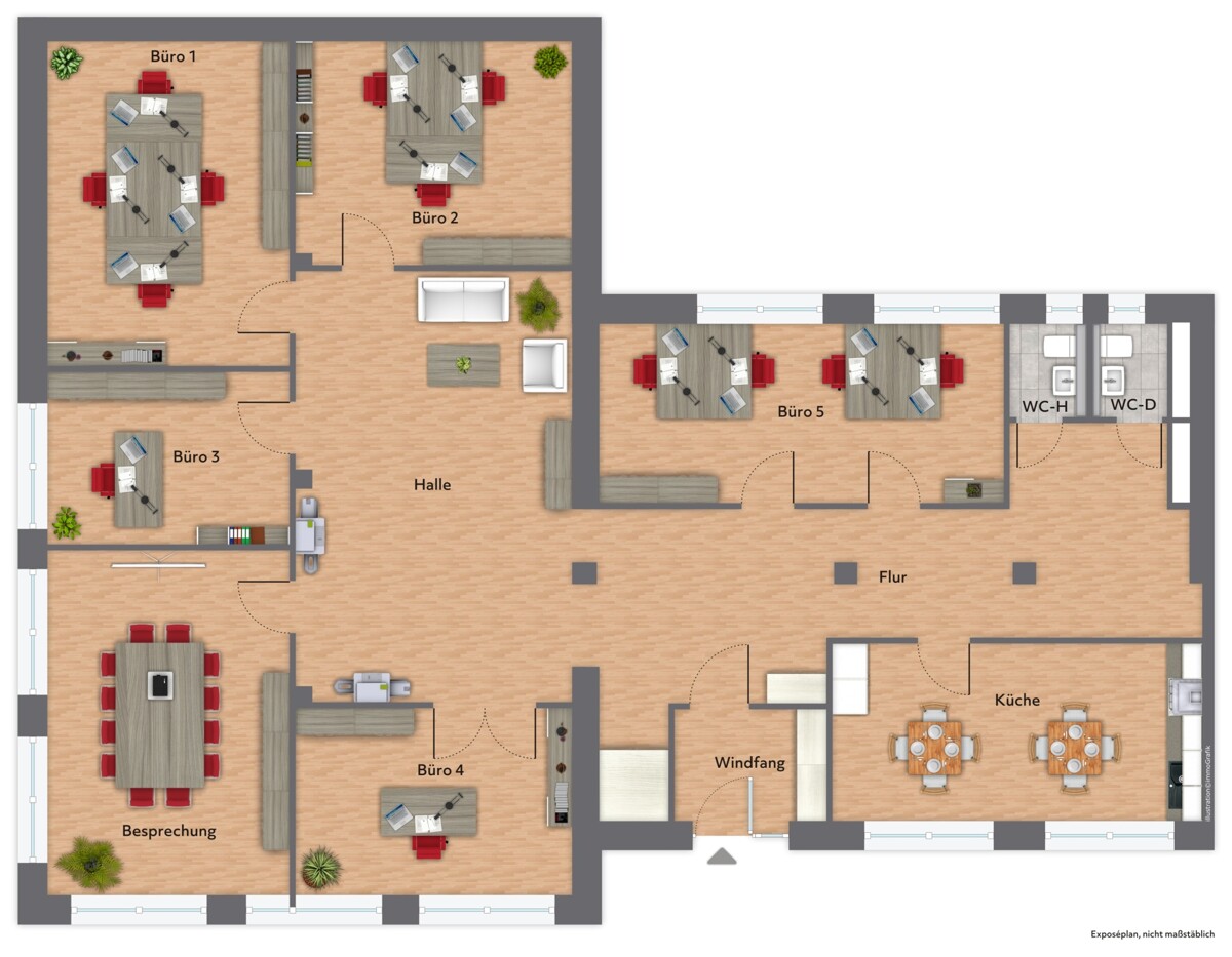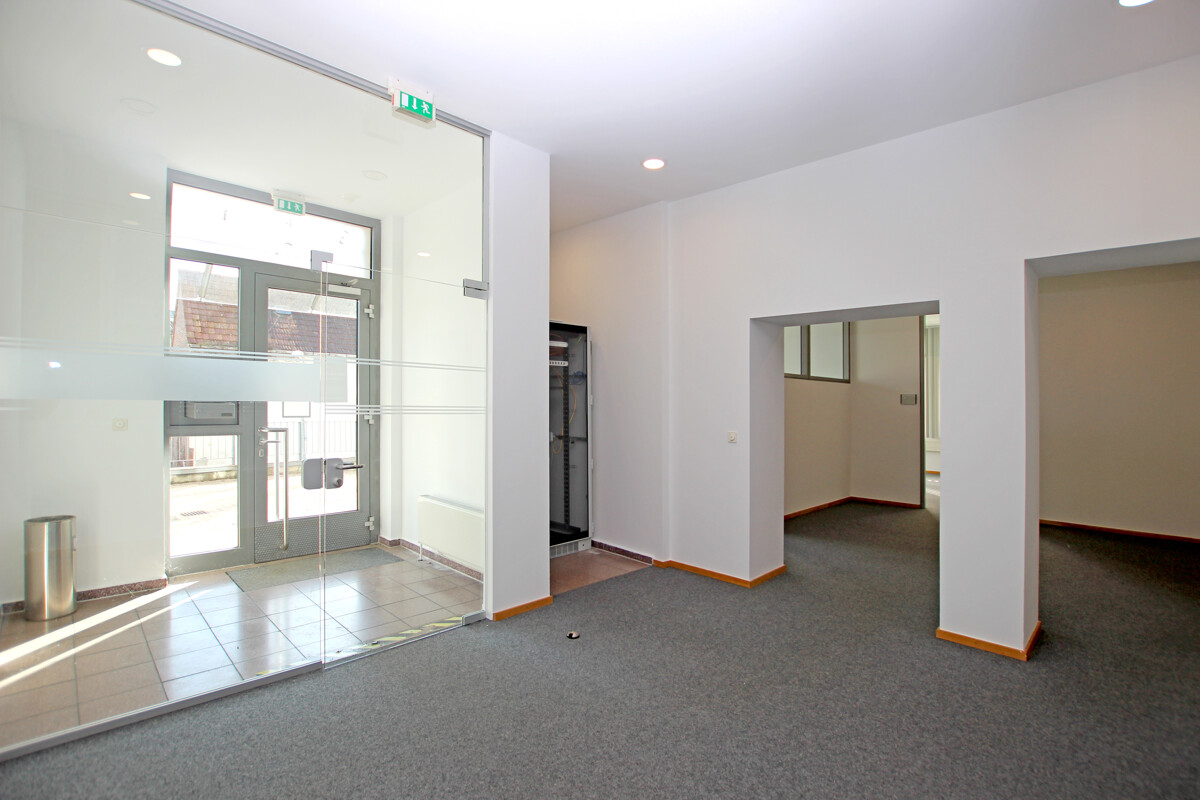 Bereits im Eingangsbereich entsteht ein geordneter erster Eindruck, von dem aus sich die Fläche logisch in die einzelnen Bereiche erschließt. Insgesamt stehen sieben Räume zur Verfügung, die eine übersichtliche Organisation von Arbeitsplätzen, Besprechungssituationen oder separaten Funktionsbereichen ermöglichen. Die Aufteilung unterstützt kurze Wege und eine angenehme Arbeitsroutine, ohne den Charakter einer klassischen Bürofläche zu verlieren.