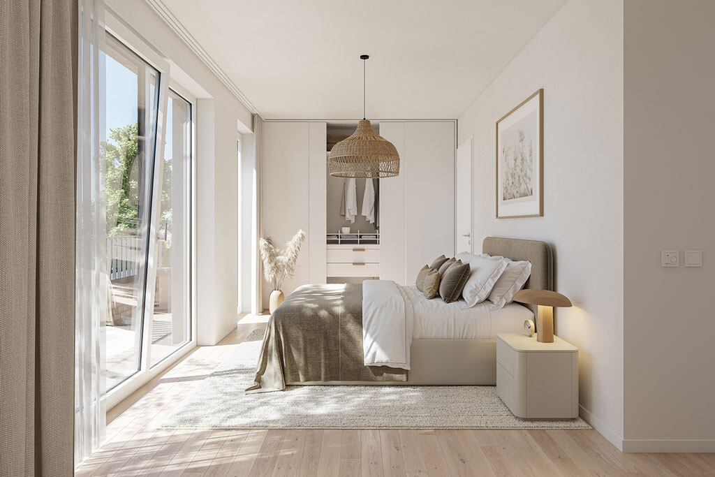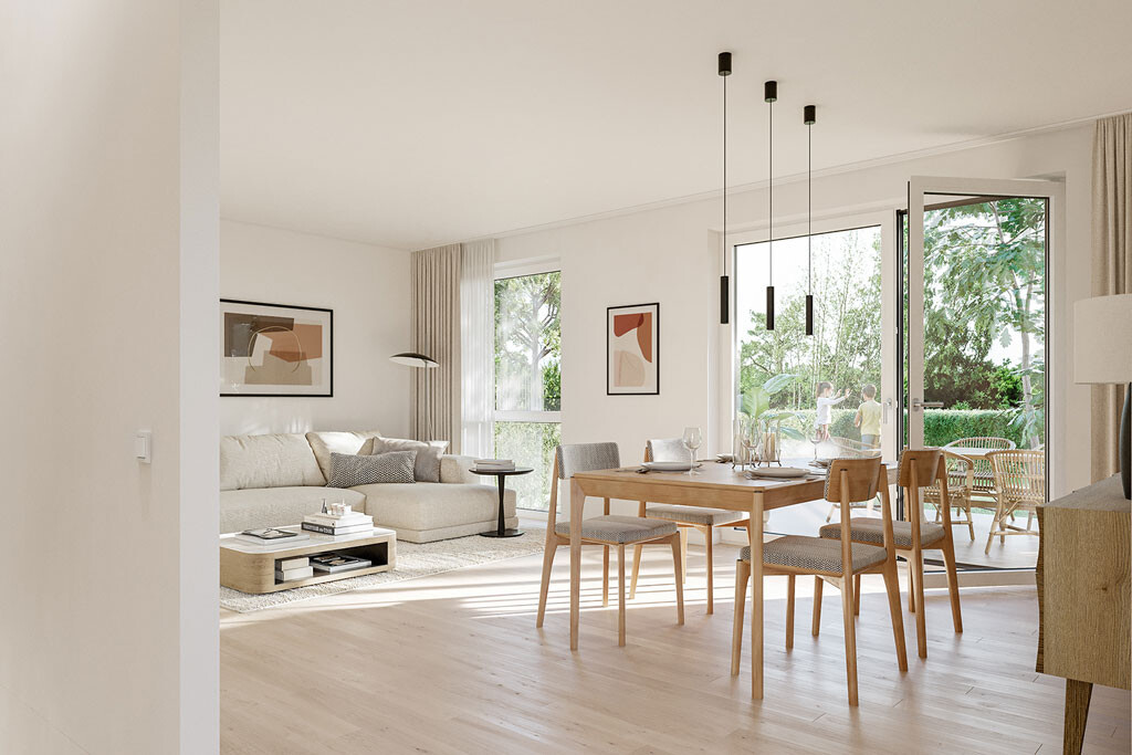 Insgesamt verfügen die Häuser über 5,5 Zimmer – darunter ein offener, heller Wohn- und Essbereich im Erdgeschoss mit direktem Zugang zur Terrasse und dem eigenen Garten. Die offene Küche schafft eine moderne, kommunikative Wohnatmosphäre und kann individuell geplant und separat erworben werden, sodass Sie Ihre persönlichen Wünsche und Vorstellungen perfekt umsetzen können. Bodentiefe Fenster sorgen für viel Tageslicht und eine nahtlose Verbindung zwischen Innen- und Außenbereich.