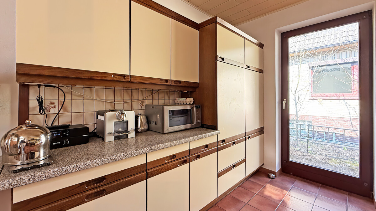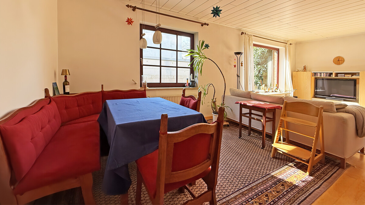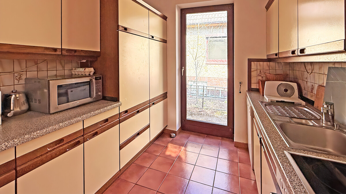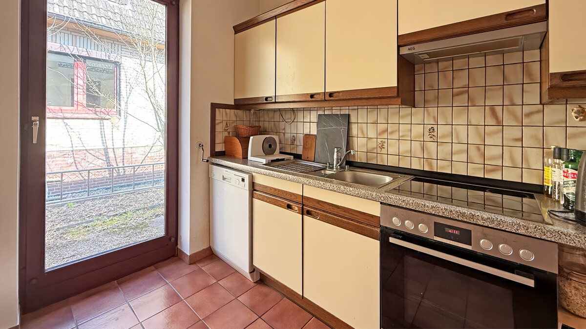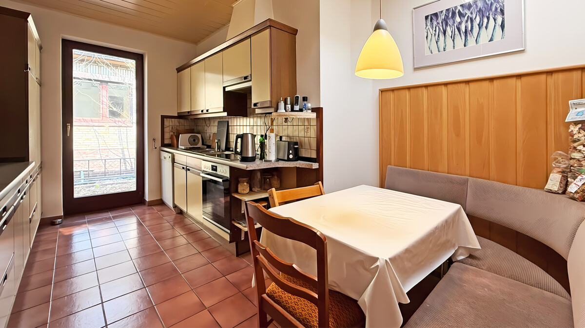 Die geschlossene Küche ist mit einer Einbauküche sowie einer gemütlichen Sitzecke ausgestattet. Ein zusätzliches Oberlicht sorgt hier für angenehmes Tageslicht und eine freundliche Atmosphäre.