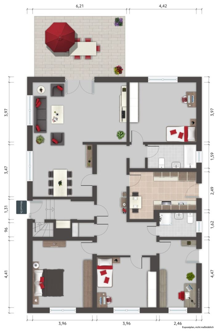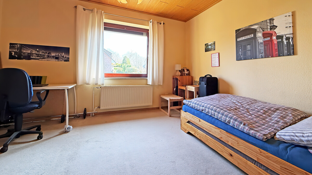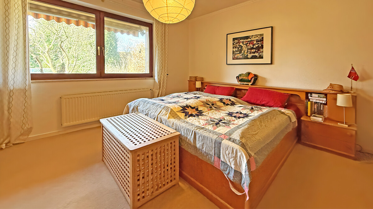 Der Bungalow verfügt über insgesamt vier weitere Zimmer, die flexibel als Schlaf-, Kinder-, Gäste- oder Arbeitszimmer genutzt werden können. Zwei Tageslichtbäder – ein Duschbad sowie ein Vollbad – bieten zusätzlichen Komfort im Alltag.