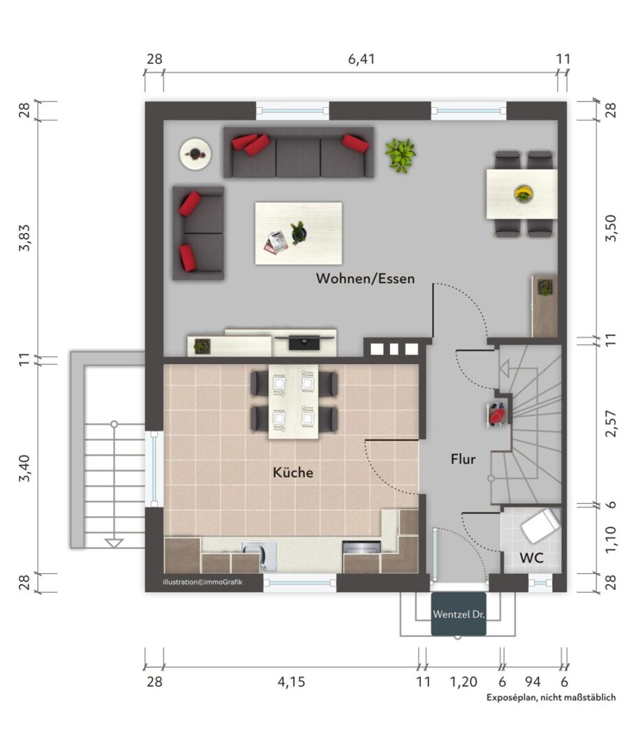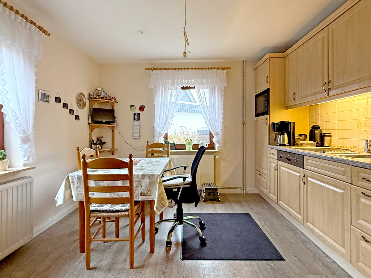 Beim Betreten des Hauses empfängt Sie ein großzügiger Eingangsbereich, der nahtlos in den lichtdurchfluteten Wohnbereich übergeht. Hier bieten sich vielfältige Gestaltungsmöglichkeiten, um eine behagliche Atmosphäre zu schaffen. Die angrenzende Küche ist funktional gestaltet und lädt zu geselligen Kochabenden ein.