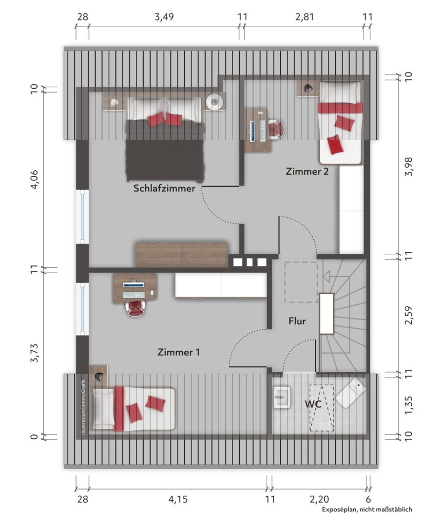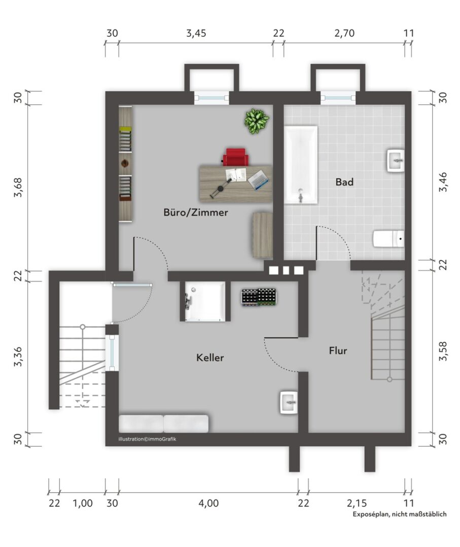 Im Obergeschoss befinden sich drei gut geschnittene Zimmer, die als Schlaf-, Kinder- oder Arbeitszimmer genutzt werden können. Ein kleines Bad mit Waschbecken und WC befindet sich ebenfalls auf dieser Ebene. Der Keller bietet nicht nur Stauraum, sondern auch das Hauptbadezimmer, das die Flexibilität des Hauses unterstreicht.