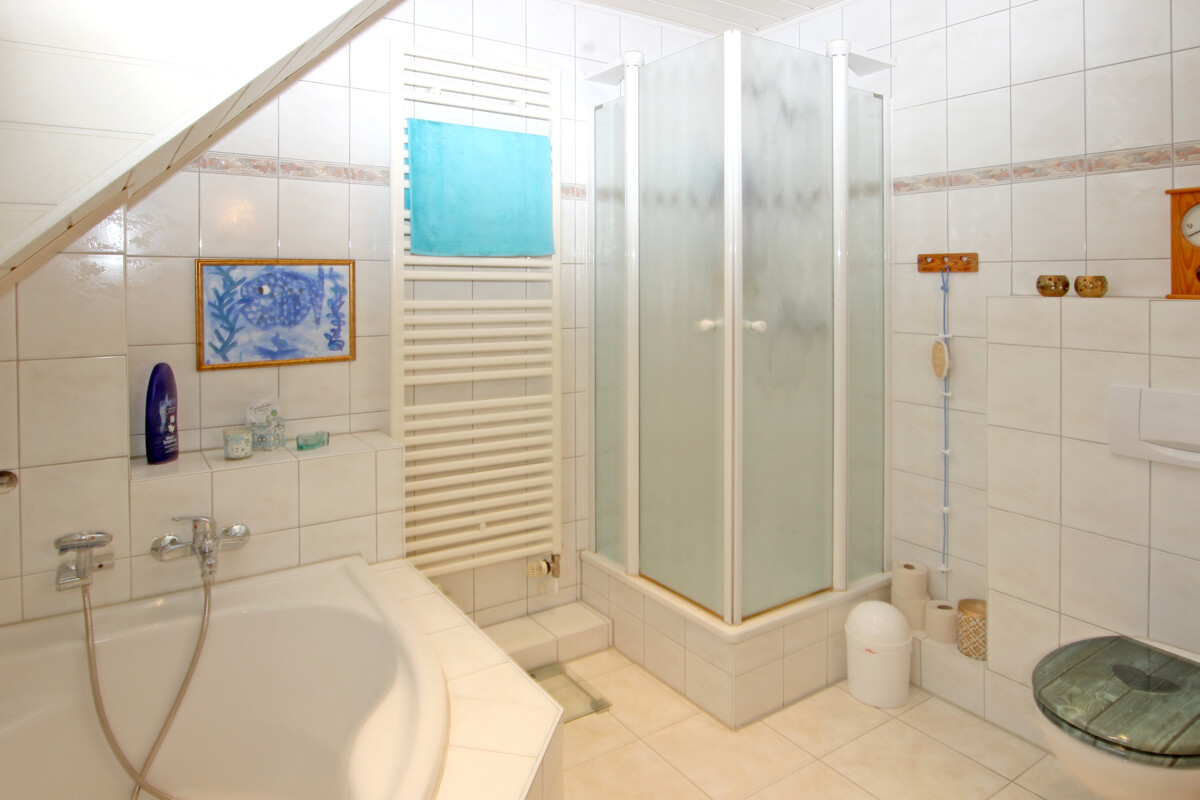 Im Bad befindet sich neben der Fußbodenheizung auch ein großer Handtuchheizkörper.