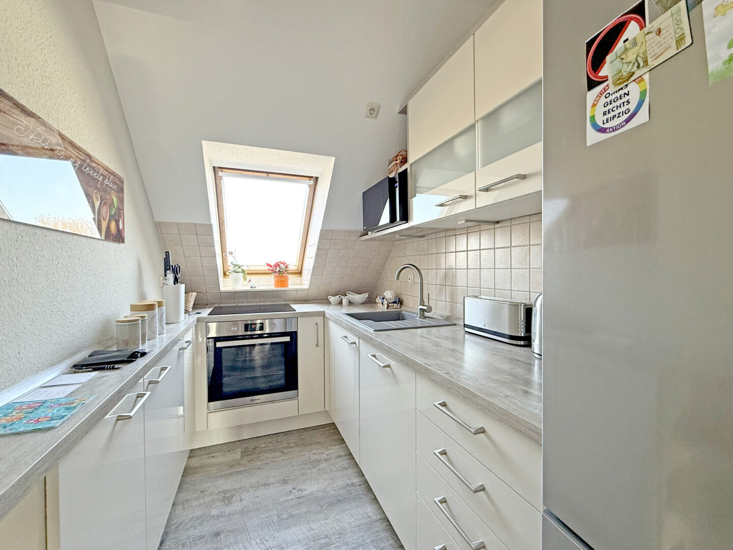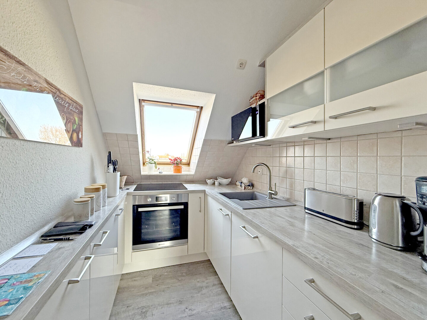 Die Küche präsentiert sich kompakt und zugleich äußerst funktional: eine hochwertige Maßanfertigung mit durchdachtem Stauraum und vollständiger Ausstattung – perfekt für alle, die Wert auf Qualität und Effizienz legen.