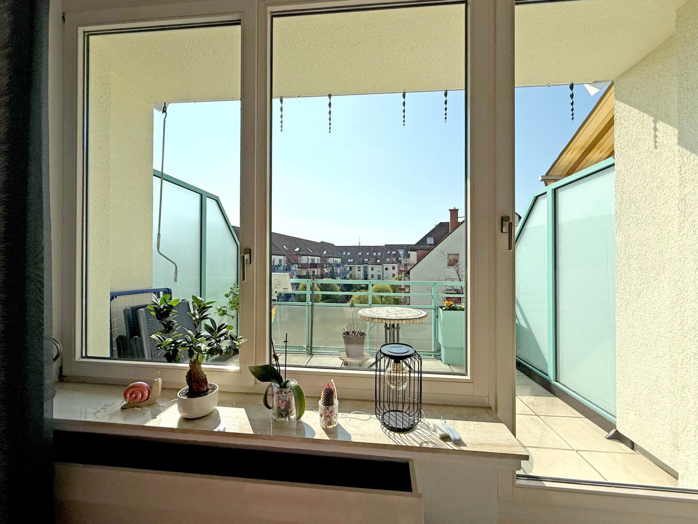 Der Wohnbereich bildet das Herzstück der unteren Ebene: Großzügig geschnitten und geprägt von einer weiten Fensterfront, öffnet sich der Raum hin zum sonnigen Südbalkon. Hier genießen Sie entspannte Stunden mit Blick in die grüne, liebevoll gepflegte Wohnanlage – ein Ort der Ruhe mitten im Alltag.
