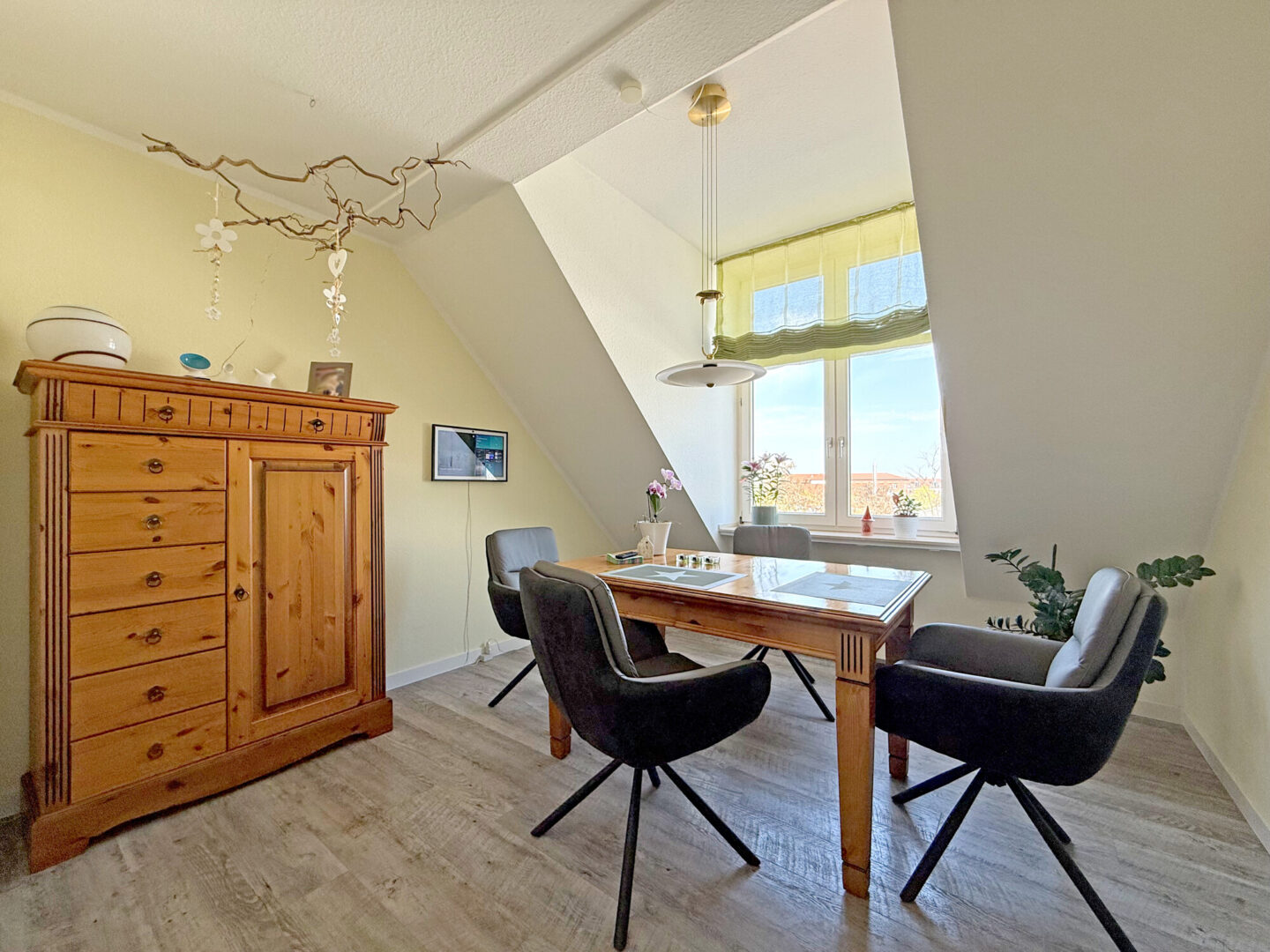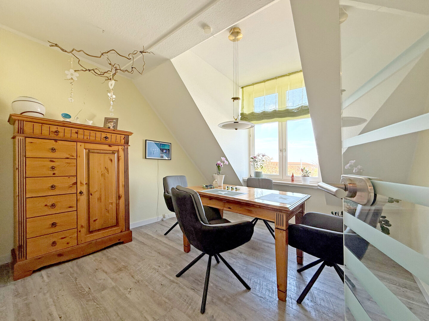 Angrenzend lädt das helle Esszimmer mit seiner charmanten Fenstergaube zu gemeinsamen Mahlzeiten ein.