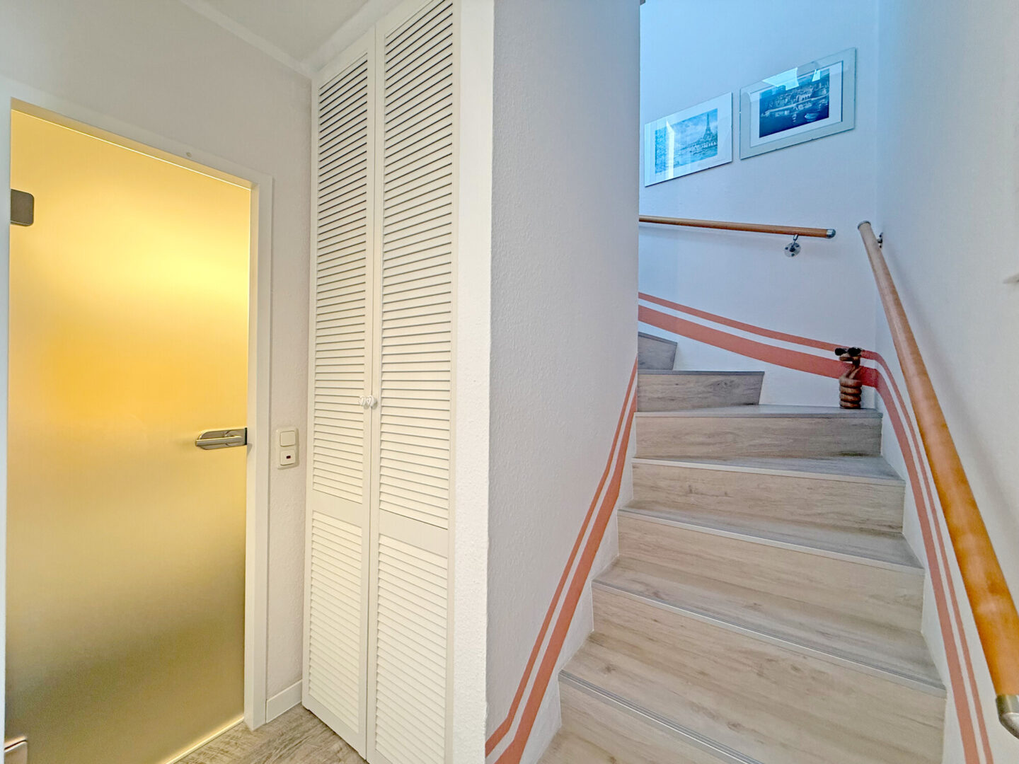 Ein weiteres Highlight ist das stilvoll gestaltete Gäste-Duschbad auf dieser Ebene, das 2017 aufwendig modernisiert wurde. Hochwertige Vollholz-Einbauschränke und eine dezente indirekte Beleuchtung schaffen hier eine Atmosphäre von Eleganz und Komfort.