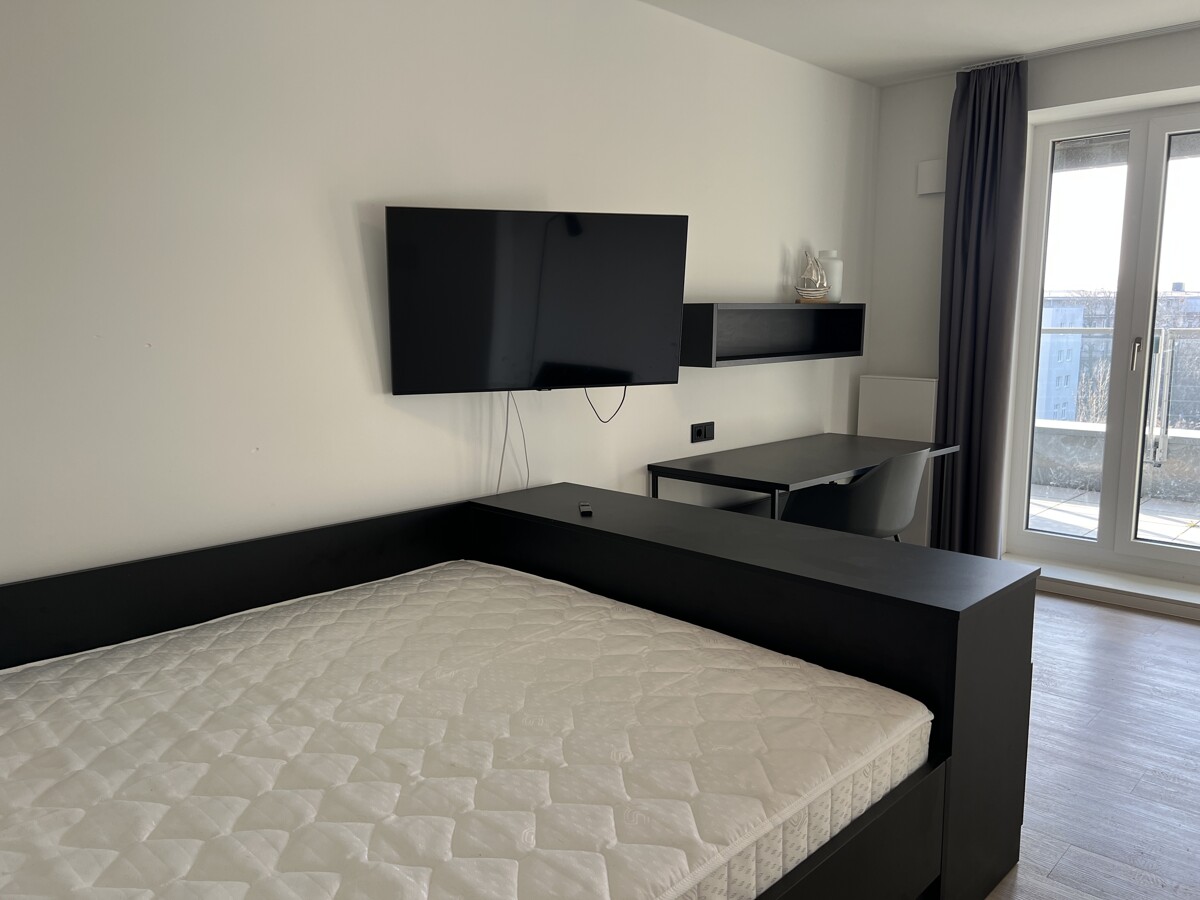 Der Wohn-und Schlafbereich verfügt über hochwertige Möbel, bodentiefe Fenster sowie einen modernen Bodenbelag, die eine angenehme Atmosphäre schaffen. Für Deine Unterhaltung steht außerdem ein Flachbildfernseher bereit.