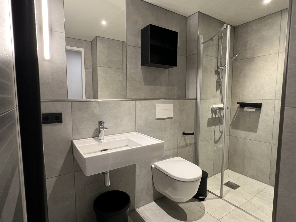 Das Badezimmer ist modern gestaltet und verfügt neben hellen Fliesen über eine Walk-In Dusche, ein WC und ein Waschbecken. Ein Handtuchheizkörper in Schwarz rundet das stimmige Design ab.