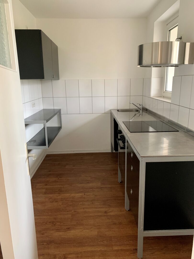 Eine Einbauküchenzeile inkl. Herd, Backofen und Spüle wird zur Nutzung überlassen und lässt Platz für eine Geschirr- oder Waschmaschine.
