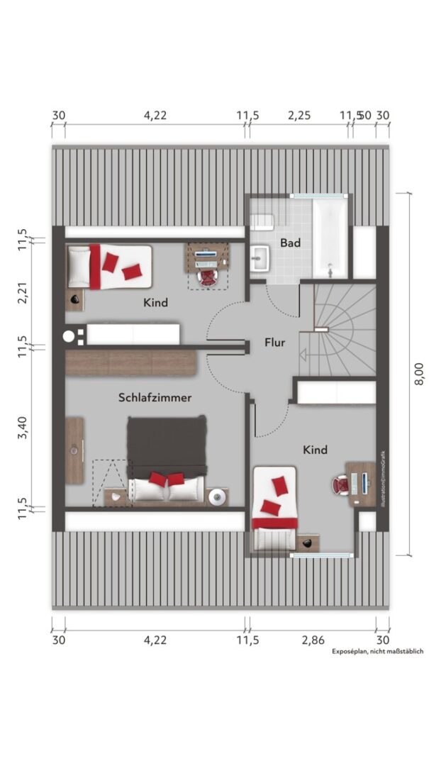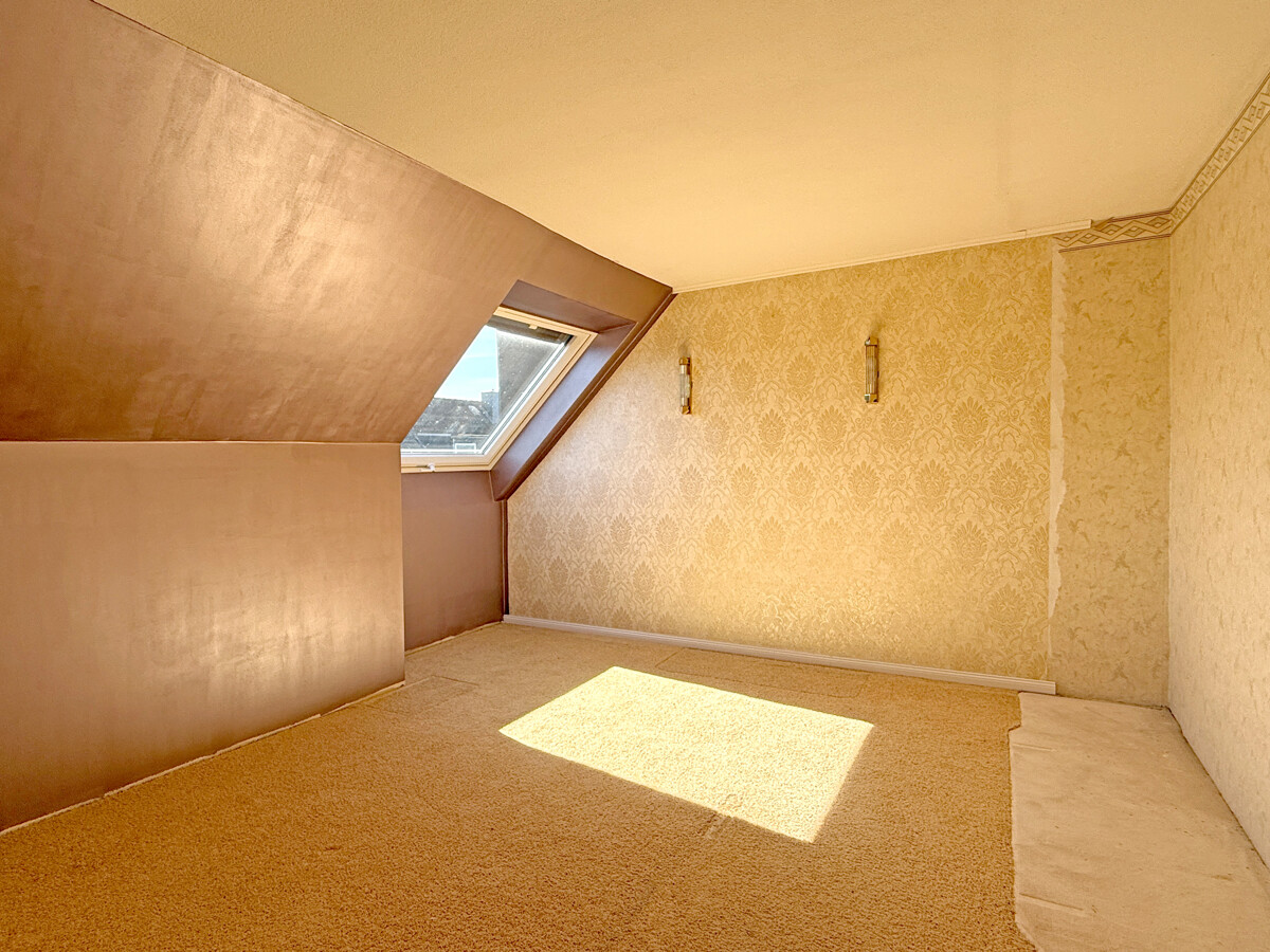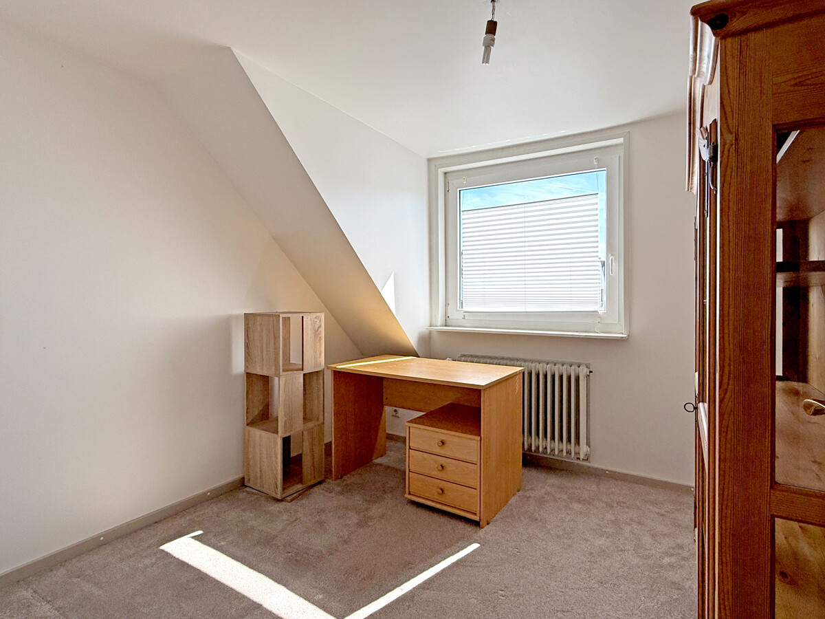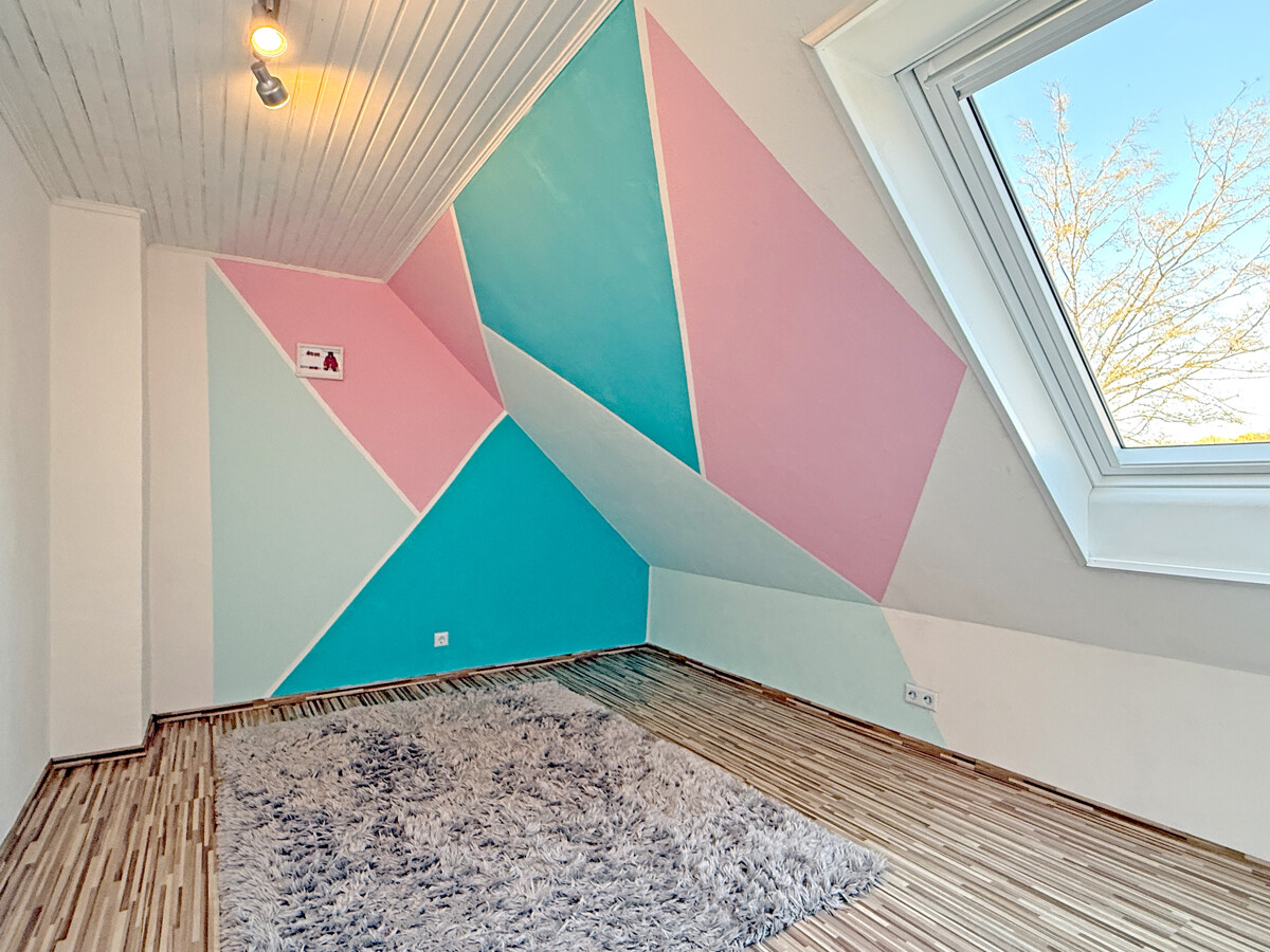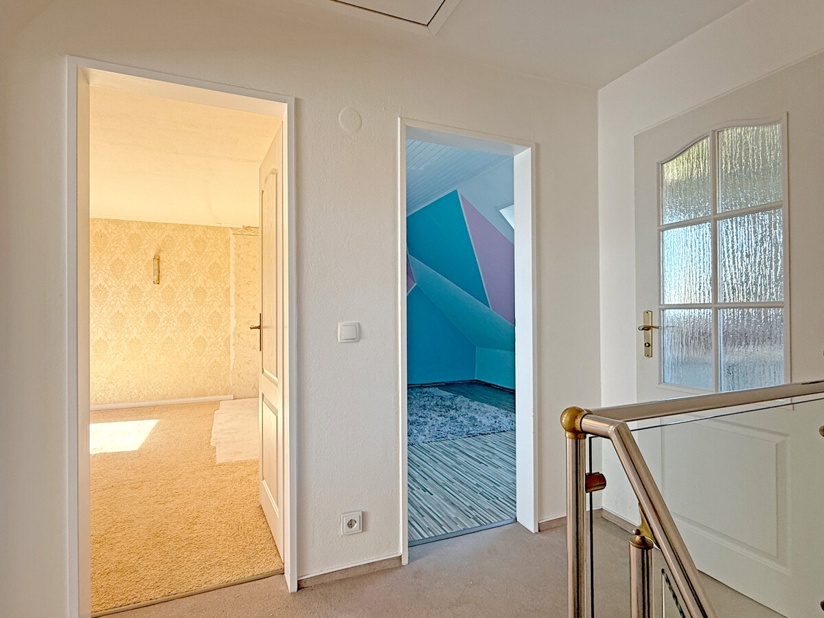 Im Obergeschoss befinden sich der Schlafbereich und zwei weitere Zimmer. Das Schlafzimmer bietet eine ruhige Rückzugsmöglichkeit, während die beiden Zimmer je nach Bedarf als Kinderzimmer, Arbeitszimmer oder Gästezimmer nutzbar sind. Ein zentraler Flur verbindet die Räume miteinander.