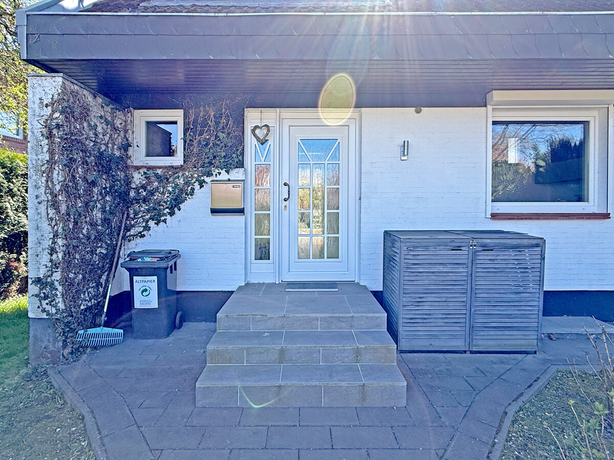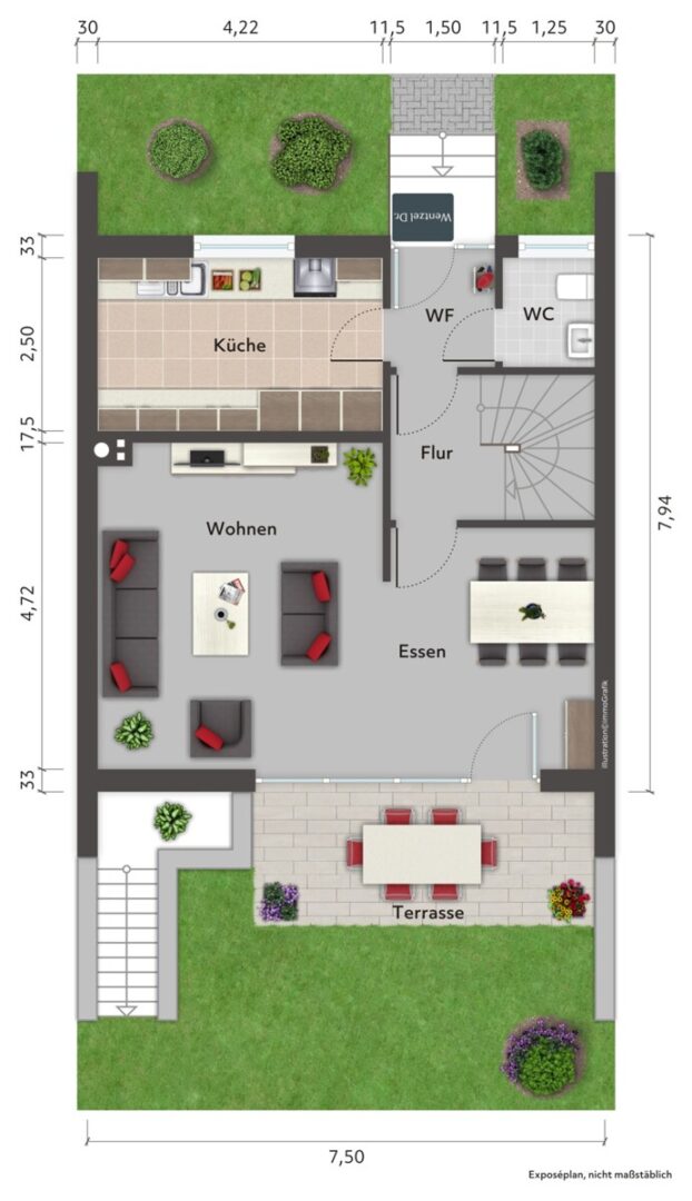 Der Außenbereich schließt direkt an den Wohn- und Essbereich an. Die Terrasse bildet den Übergang in den Garten und bietet Raum für Sitzgelegenheiten und Spielmöglichkeiten im Freien auf dem ca. 267 m² großen Grundstück.