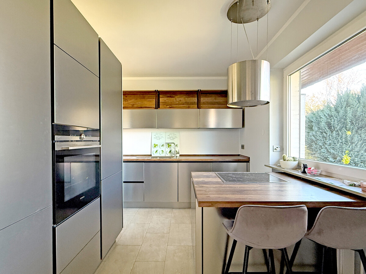 Direkt angrenzend liegt die Küche, die als moderner Arbeitsbereich gestaltet ist. Die Einbauten sind in geradliniger Optik gehalten, ergänzt durch eine Arbeitsfläche und einen integrierten Sitzplatz am Tresen. Ein Fenster bringt zusätzliches Licht an den Arbeitsplatz.