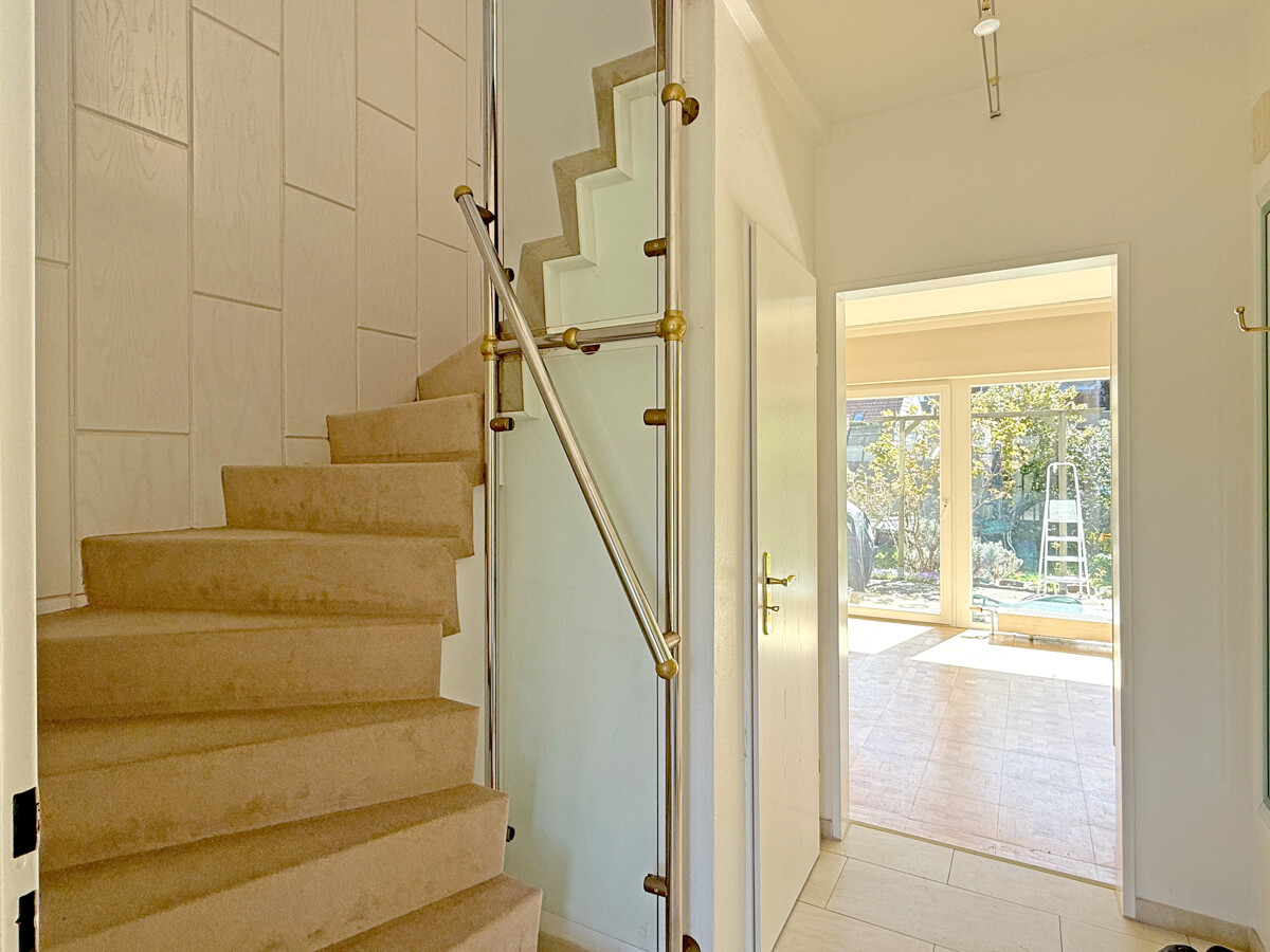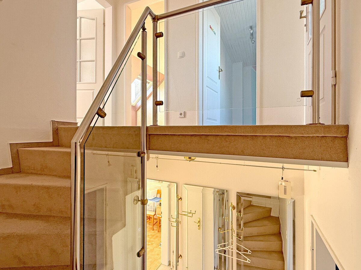 Beim Betreten wirkt das Haus hell und freundlich, mit klaren Sichtachsen und einem stimmigen Übergang in die Wohnbereiche. Der Eingangsbereich führt in einen Flur, von dem aus die Treppe in die oberen Etagen sowie die weiteren Räume im Erdgeschoss erreichbar sind. Direkt angrenzend liegt ein separates WC, das den Alltag im Erdgeschoss praktisch ergänzt.