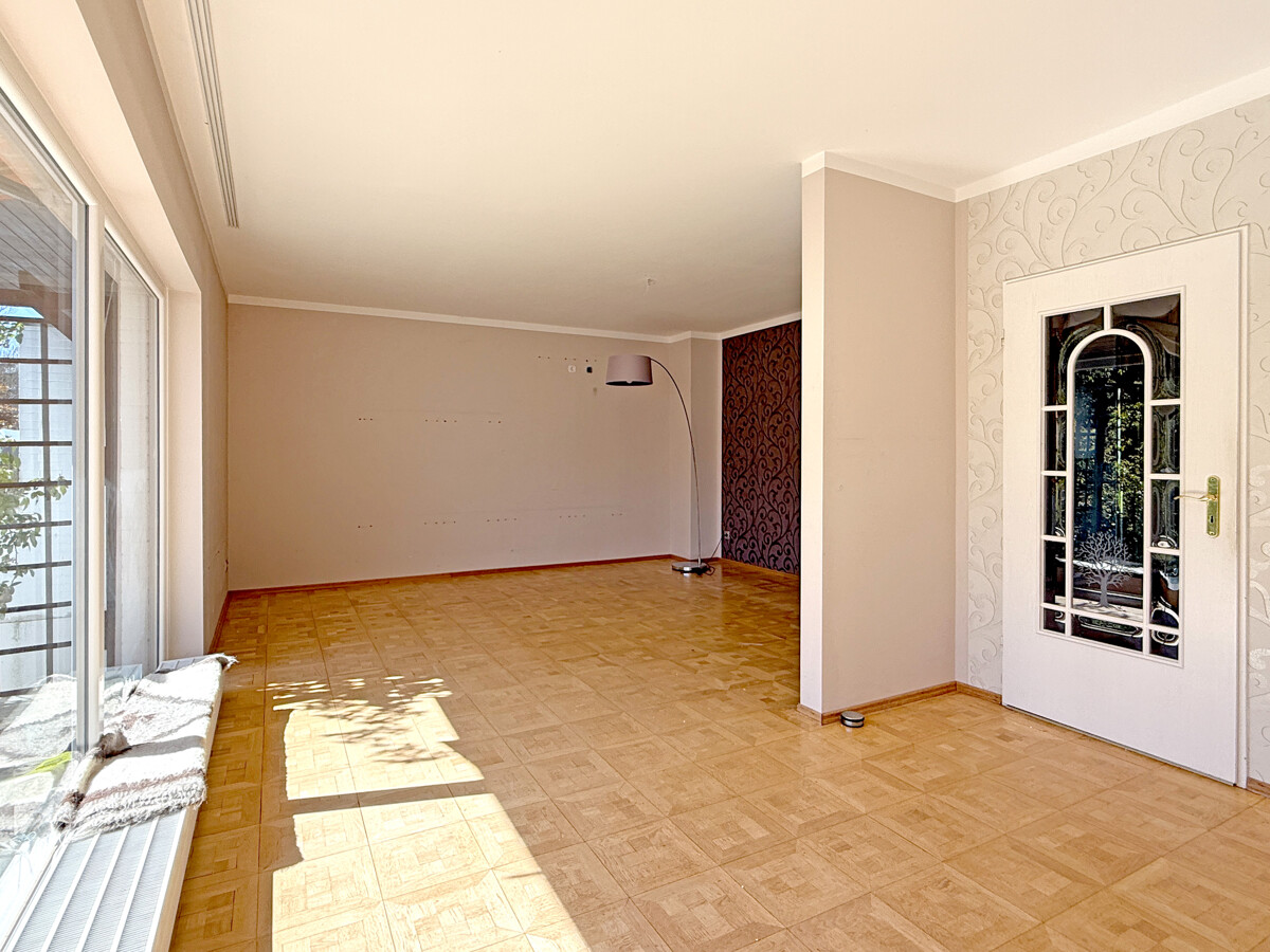 Von hier aus öffnet sich das Wohn- und Esszimmer als zentraler Mittelpunkt des Hauses. Große Fensterflächen und die breite Fensterfront sorgen für viel Tageslicht und verbinden den Raum direkt mit der Terrasse. Die Fläche lässt sich flexibel für Wohnzone und Essplatz strukturieren.