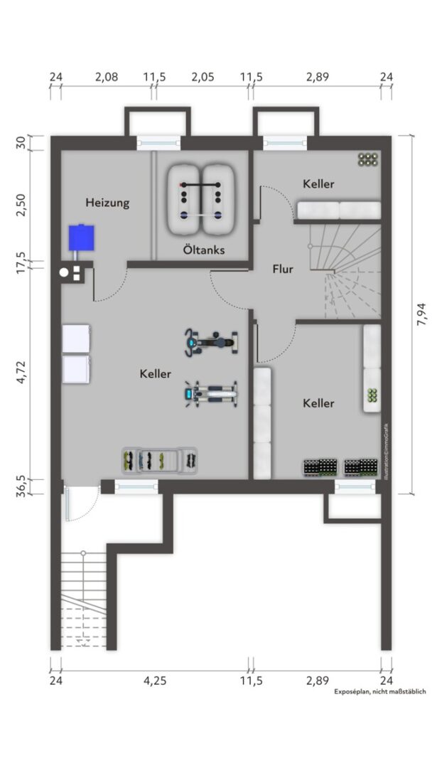Weitere Bereiche stehen im Keller zur Verfügung. Mehrere Kellerräume bieten Platz für Vorräte, Hobby und Abstellmöglichkeiten, ergänzt durch einen separaten Heizungsraum sowie den Bereich für die Öltanks.