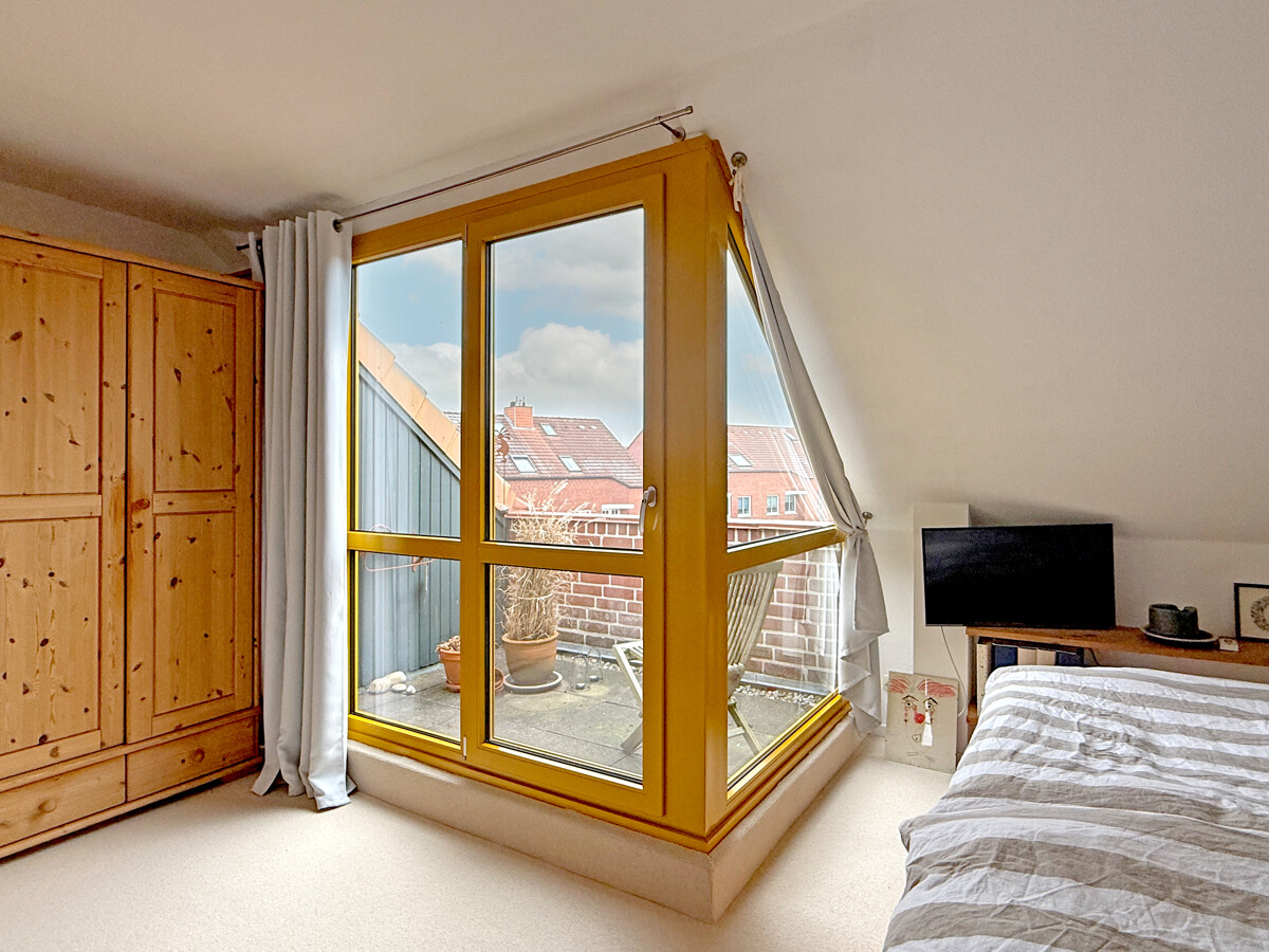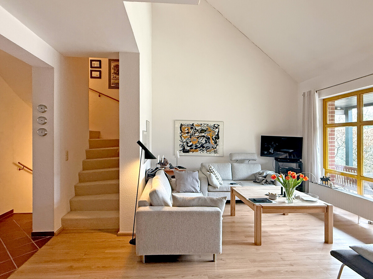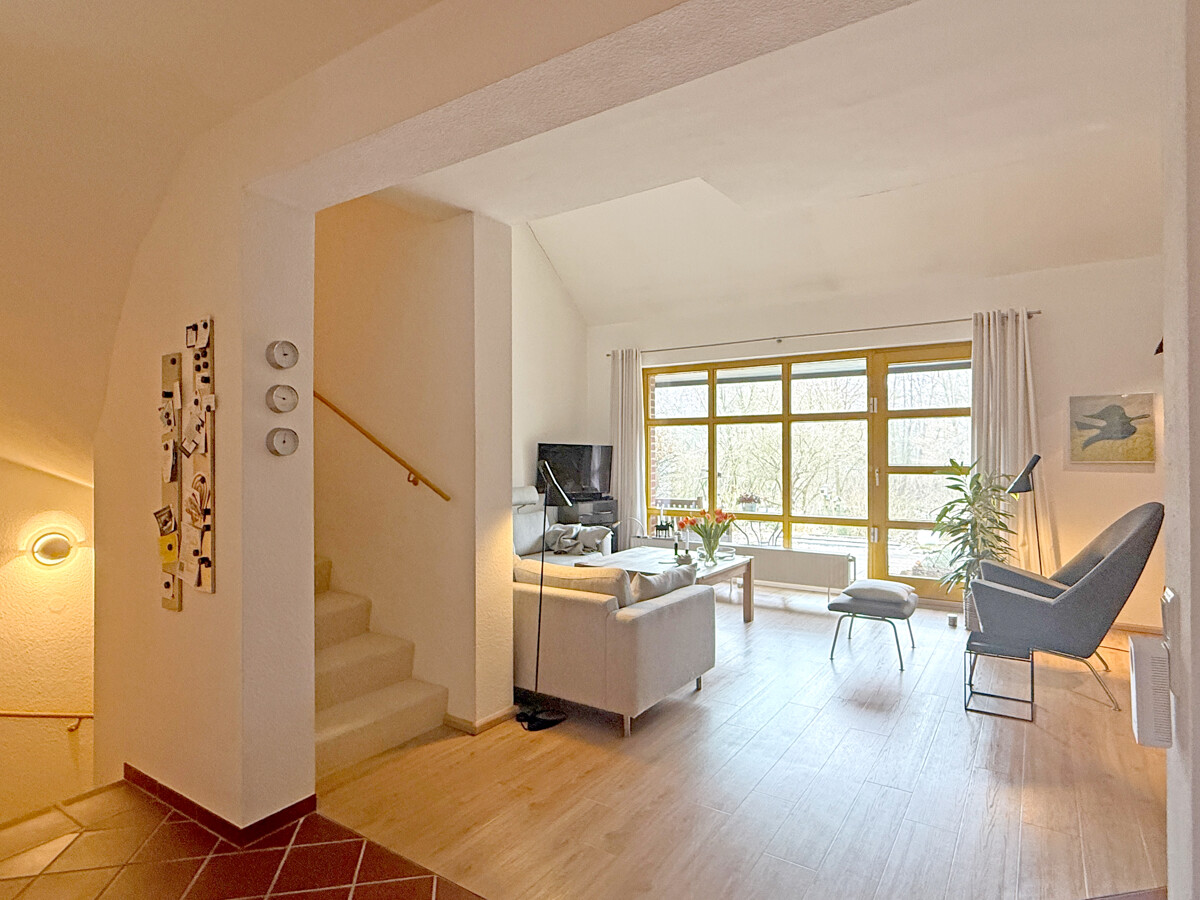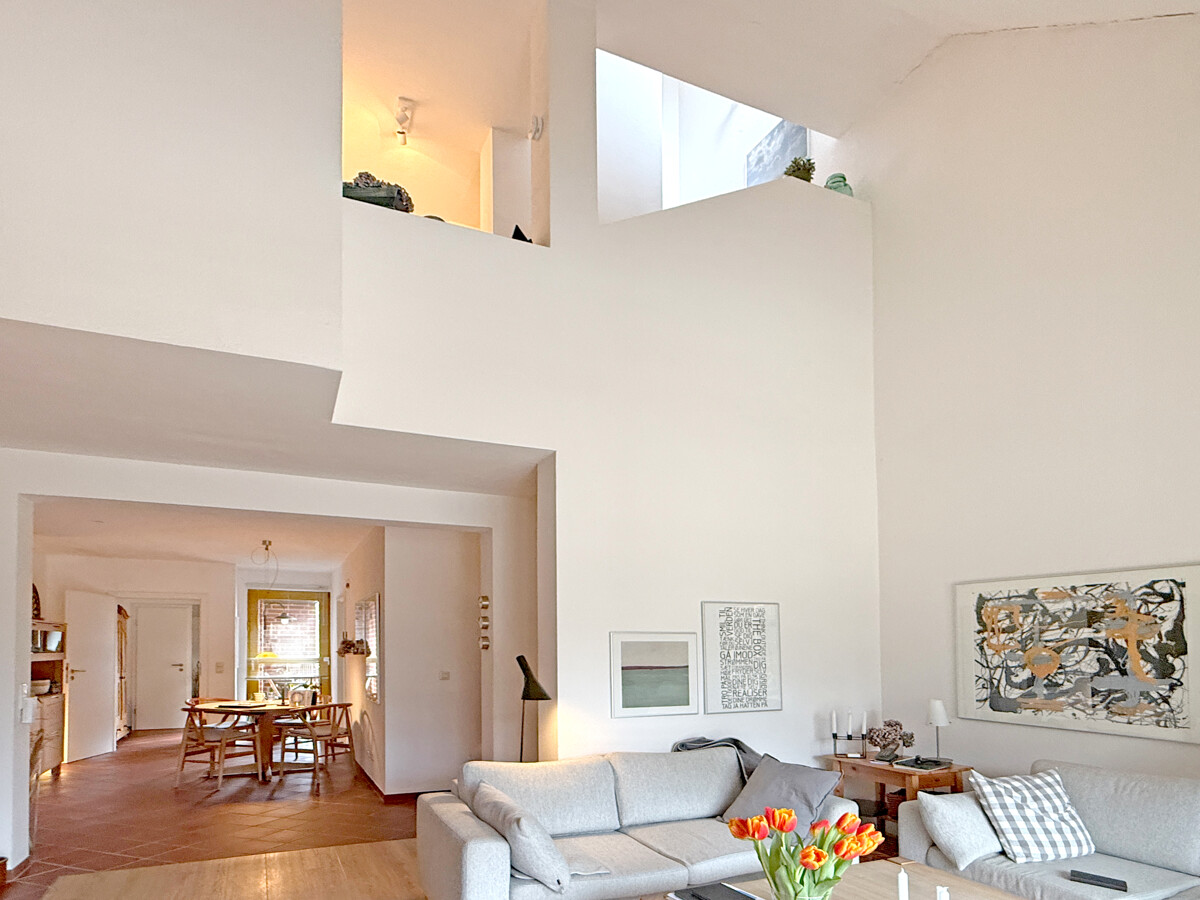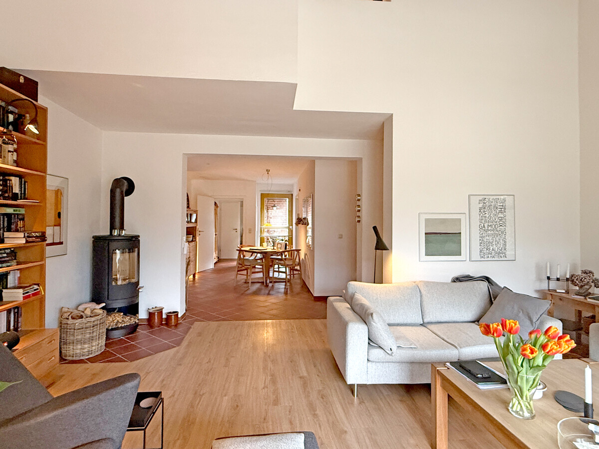 Sie betreten das Haus entweder über den ebenerdigen Kellerbereich, wo sich auch die Garage befindet, oder Sie nutzen den eigentlichen Hauseingang im ersten Obergeschoss. Von hier aus erschließt sich der Wohnbereich als zentraler Mittelpunkt des Hauses, mit guten Stellflächen und einem Wohnfluss, der Begegnung und Rückzug gleichermaßen zulässt. Von der Terrasse haben Sie einen unverbaubaren Blick in den angrenzenden Moorbekpark.