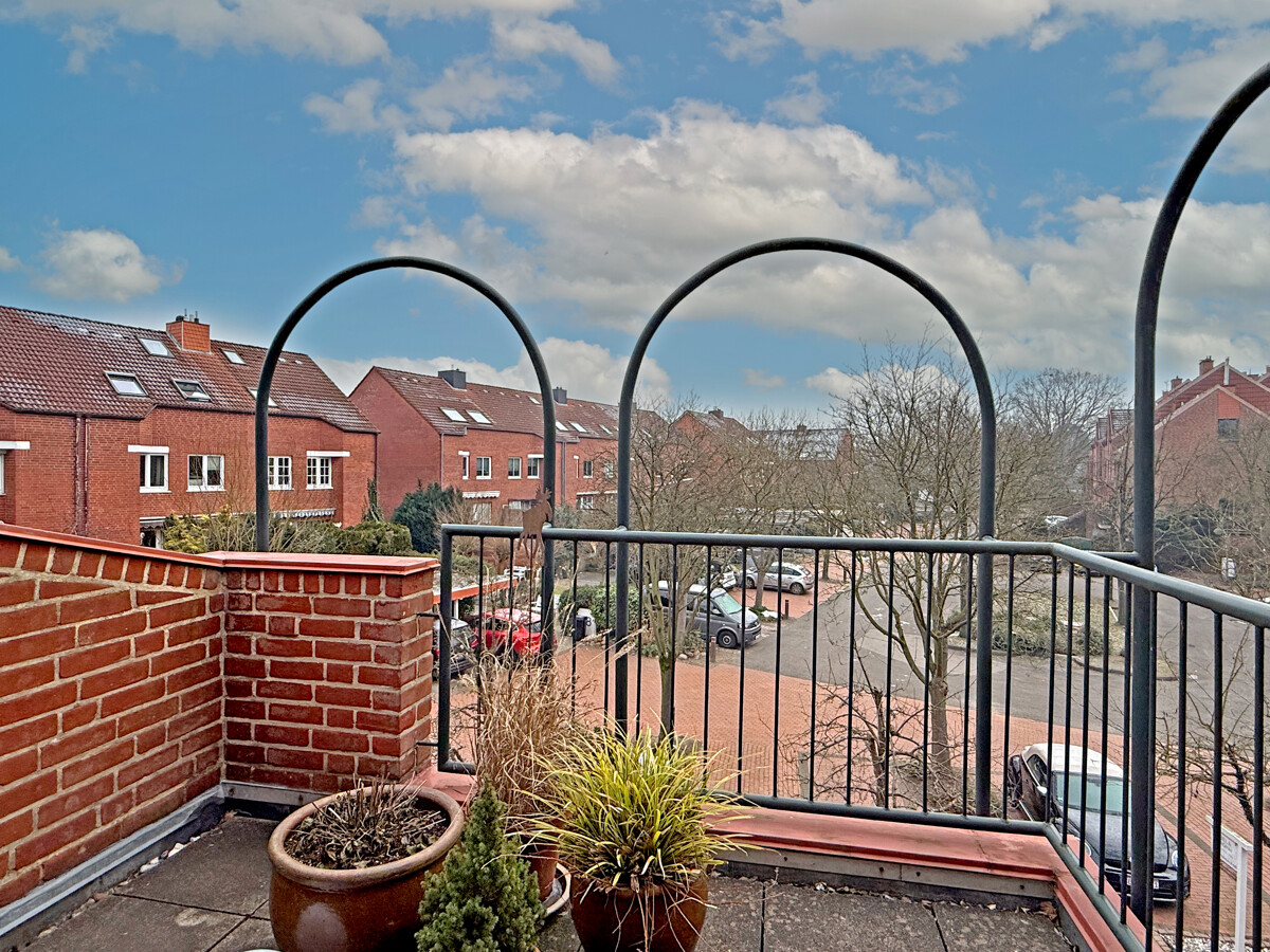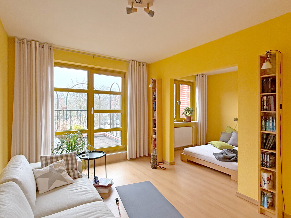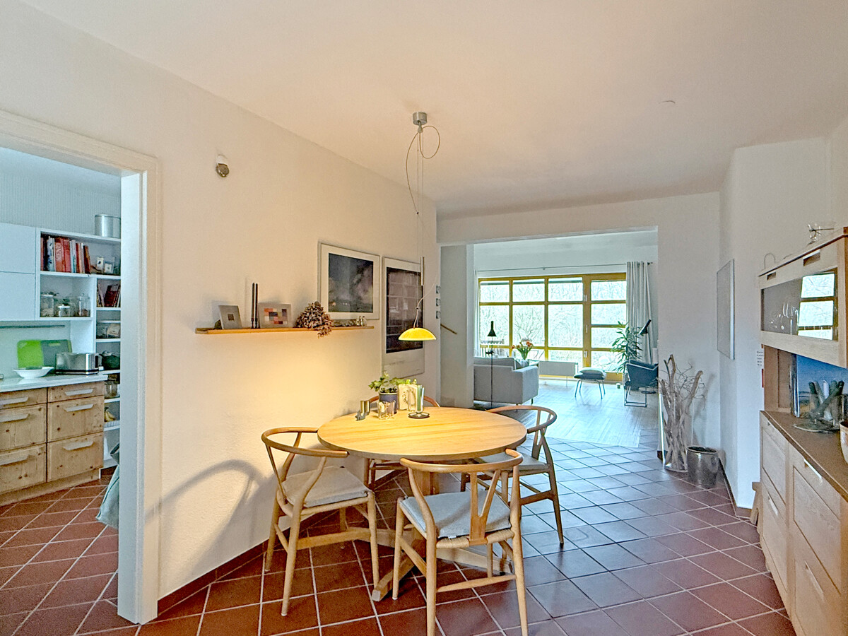 Sie betreten das Haus entweder über den ebenerdigen Kellerbereich, wo sich auch die Garage befindet, oder Sie nutzen den eigentlichen Hauseingang im ersten Obergeschoss. Von hier aus erschließt sich der Wohnbereich als zentraler Mittelpunkt des Hauses, mit guten Stellflächen und einem Wohnfluss, der Begegnung und Rückzug gleichermaßen zulässt. Von der Terrasse haben Sie einen unverbaubaren Blick in den angrenzenden Moorbekpark.