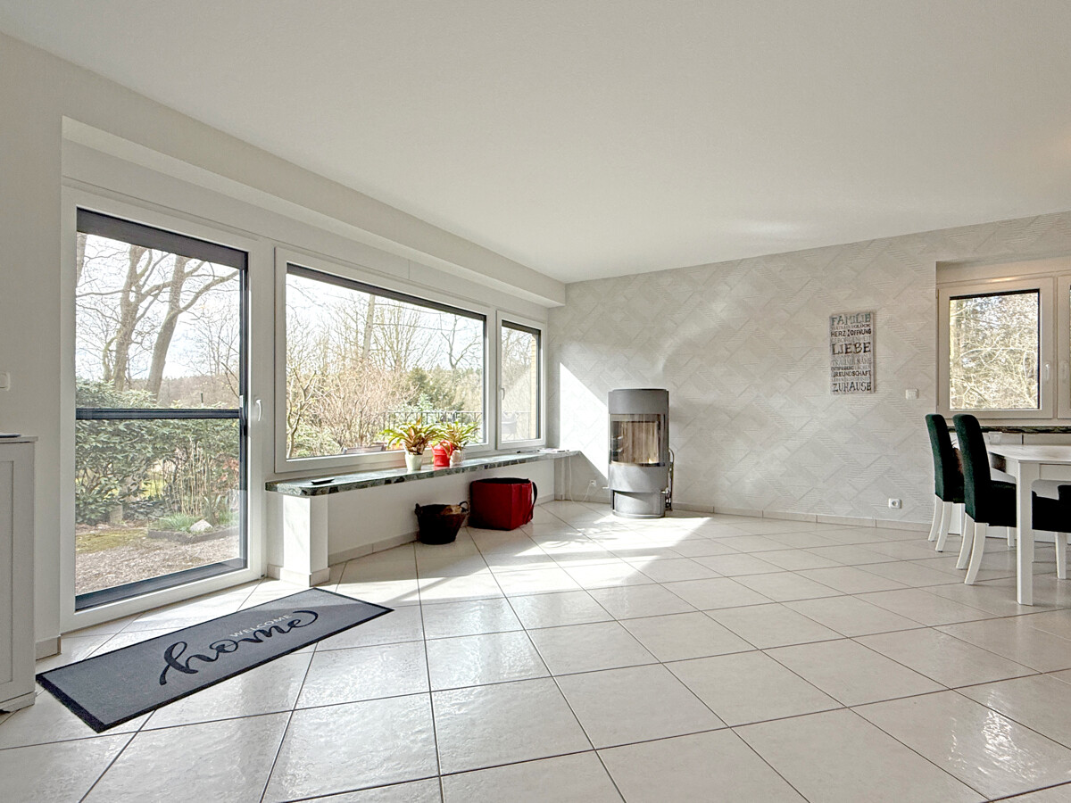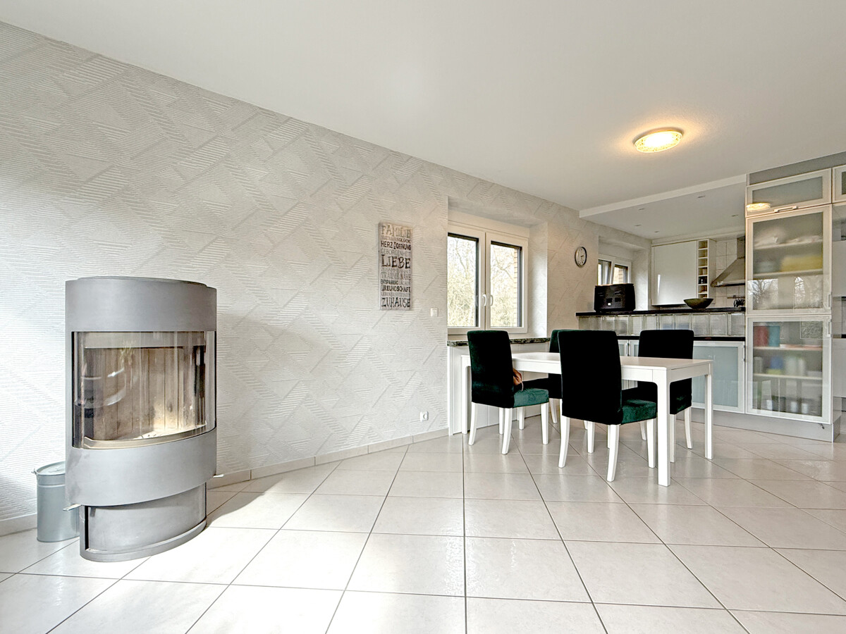 Direkt anschließend liegt das Wohn- und Esszimmer mit großformatiger Fensterfläche und einem breiten Zugang nach draußen. Der Raum wirkt durch die helle Gestaltung und die Fliesen ordentlich und gut möblierbar. Ein Kaminofen ergänzt den Wohnbereich als klar erkennbares Ausstattungsdetail.