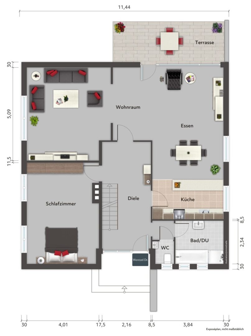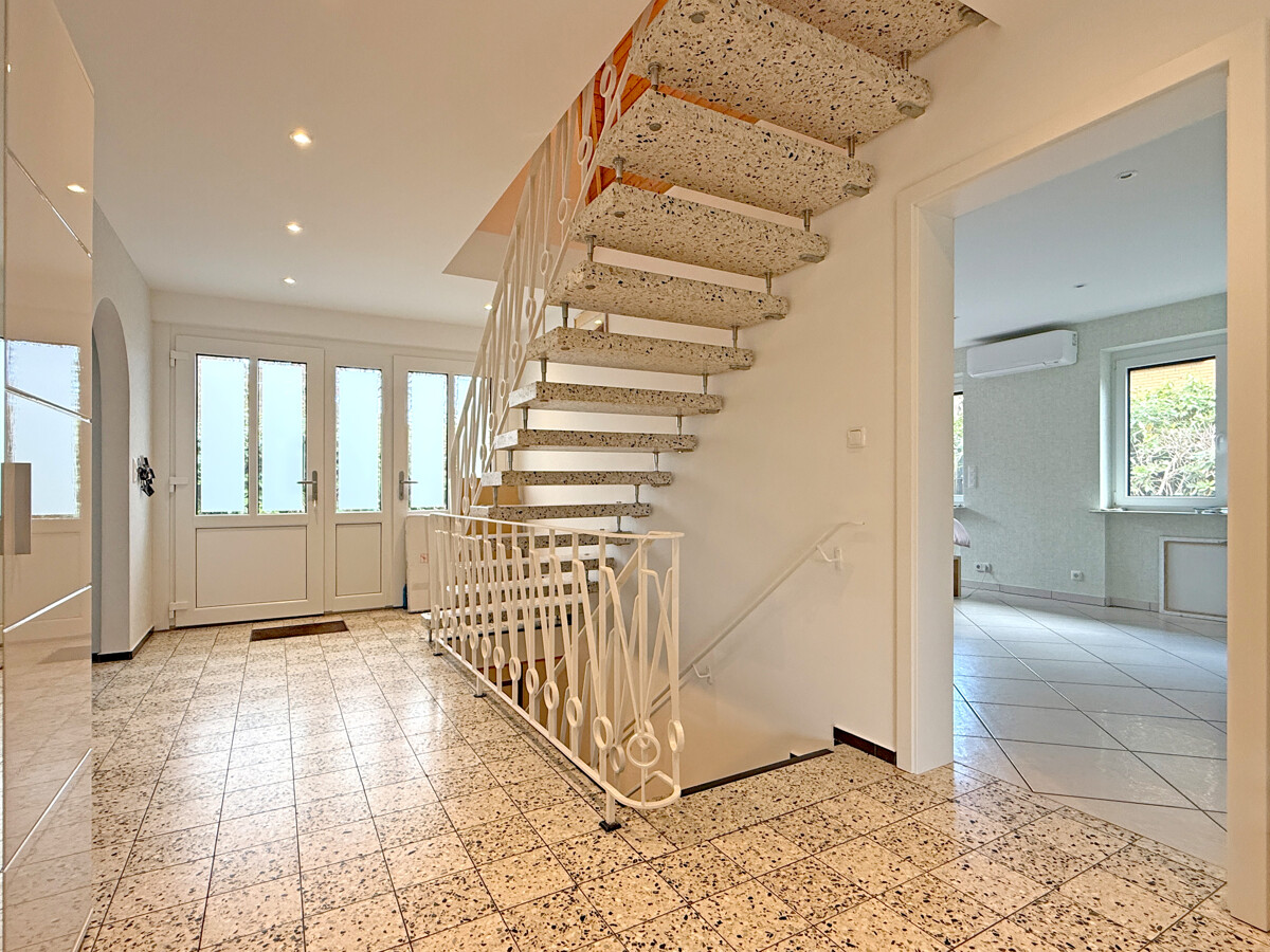 Der Eingangsbereich empfängt mit einem großzügigen Flur, gefliestem Boden und einer markanten, offenen Treppe mit Geländer.