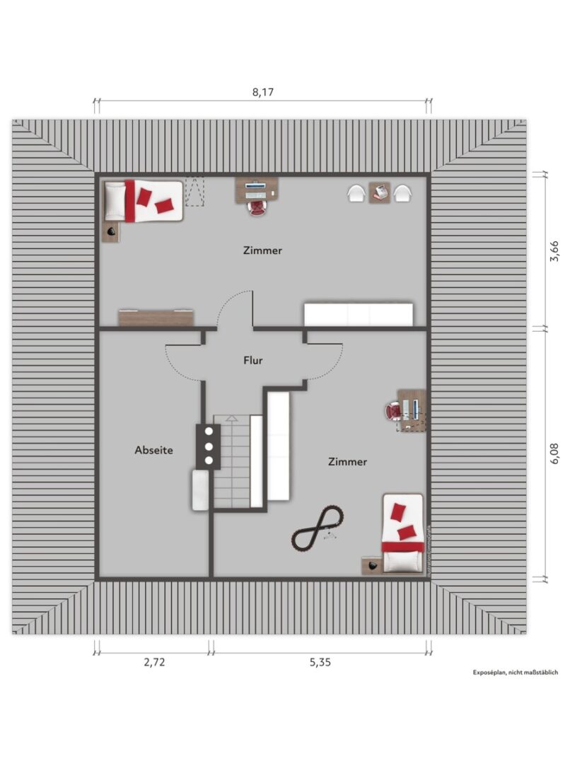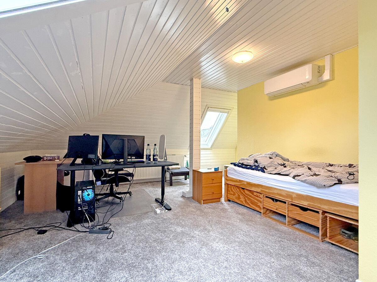Im Schlafbereich verteilen sich die weiteren Zimmer im Haus und bieten flexible Nutzungsmöglichkeiten. Das ausgebaute Dachgeschoss wirkt durch die Dachschrägen und Dachflächenfenster eigenständig und lässt sich je nach Bedarf als Kinderzimmer, Arbeitsbereich oder Hobbyraum nutzen.