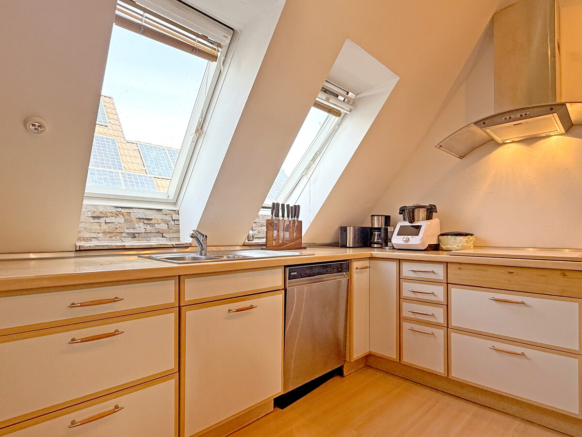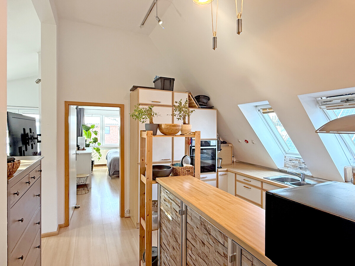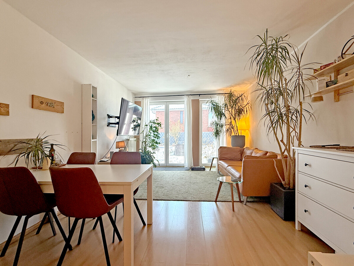 Die Einliegerwohnung nebenan verfügt über ein großes Wohn- und Schlafzimmer mit offener Wohnküche und ein helles Duschbad mit bodentiefer Dusche.
