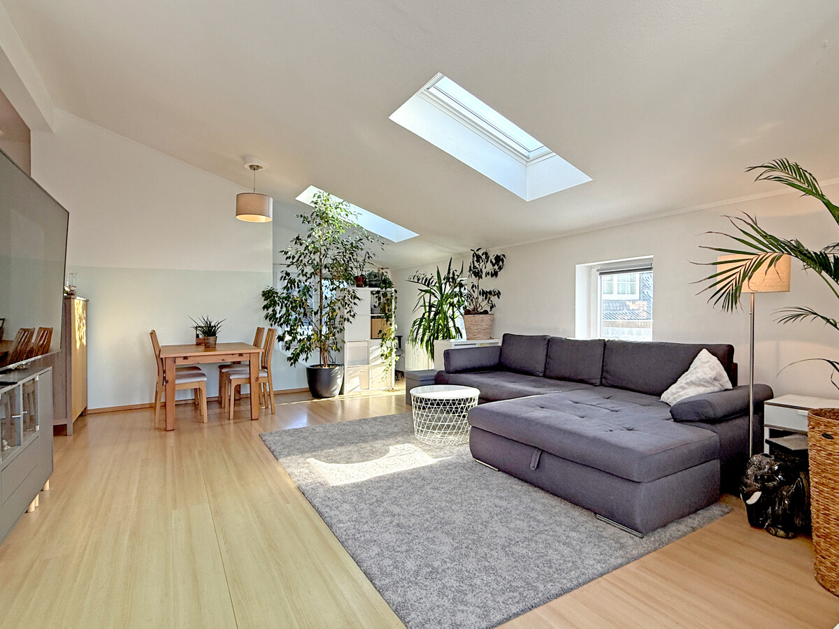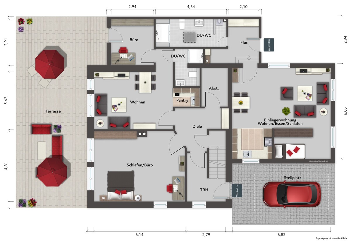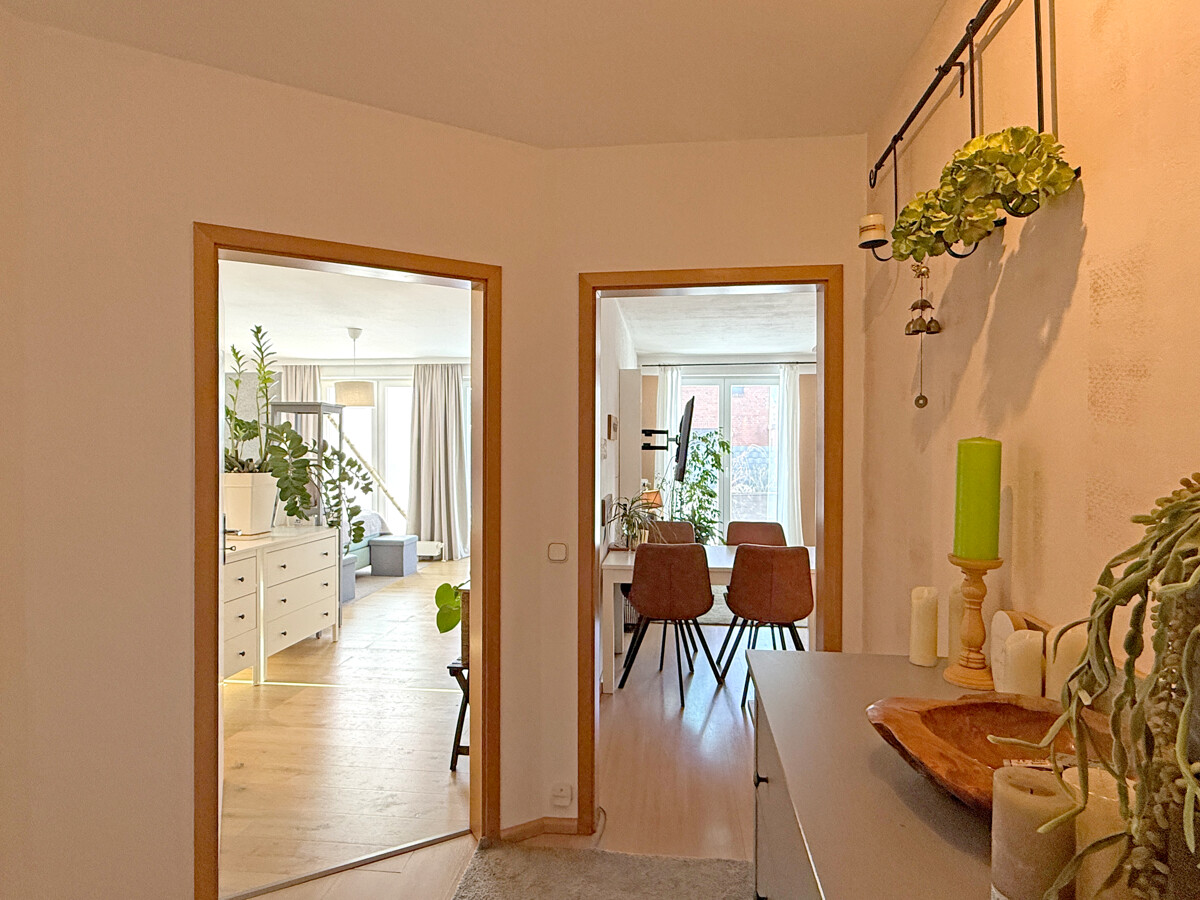 Die Einliegerwohnung nebenan verfügt über ein großes Wohn- und Schlafzimmer mit offener Wohnküche und ein helles Duschbad mit bodentiefer Dusche.