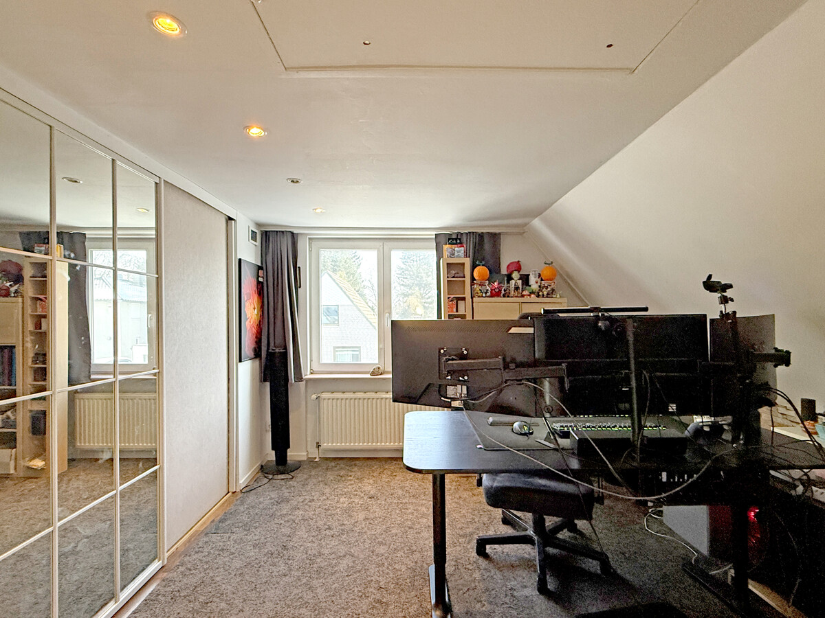 Im Obergeschoss stehen weitere flexibel nutzbare Zimmer zur Verfügung, ideal als Schlaf-, Kinder-, Gäste- oder Arbeitsräume. Auch hier gibt es eine eigene Küche, passend zur Zweifamiliennutzung. Das großzügige Bad ist mit Dusche und Badewanne ausgestattet. Ein Balkon erweitert den Wohnraum nach außen.