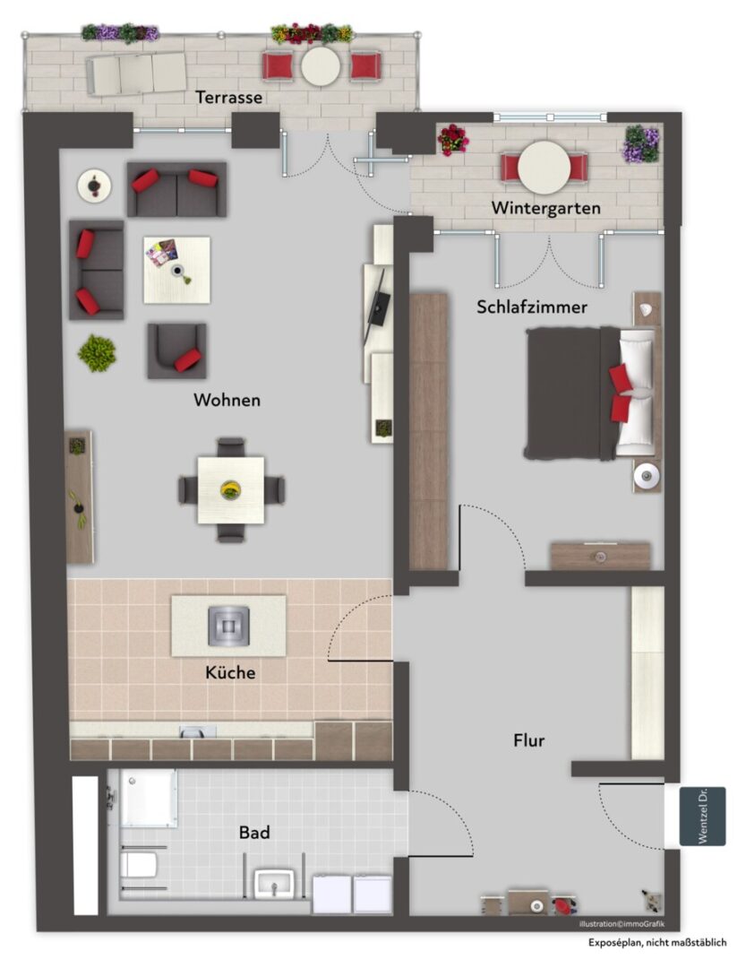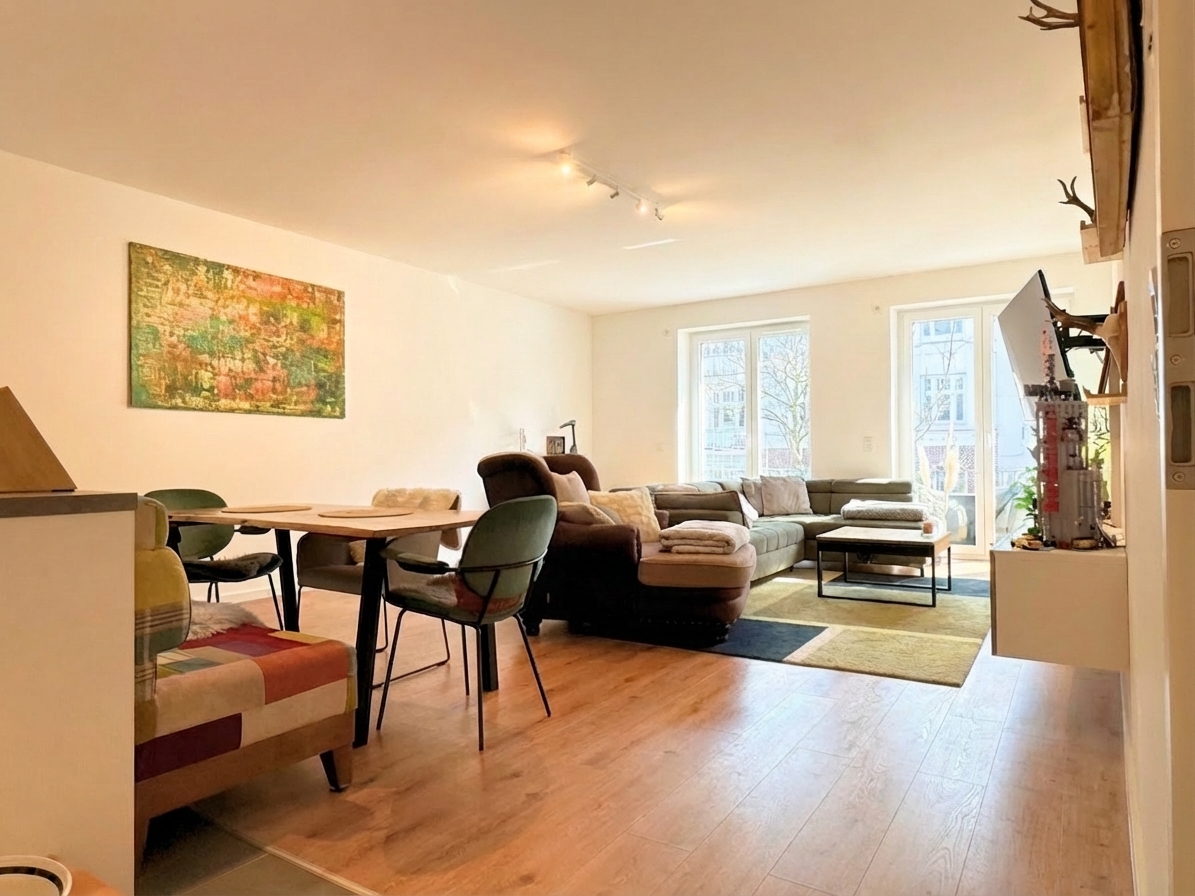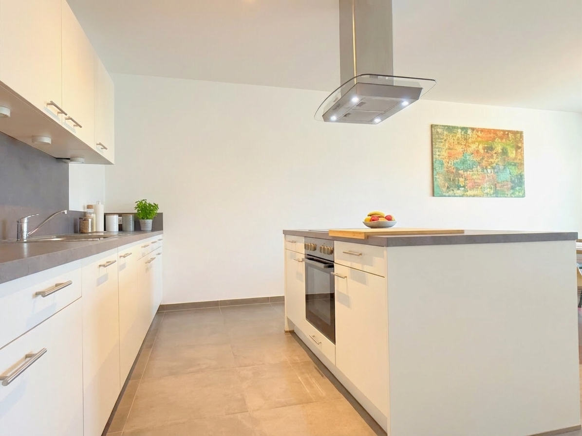 Das Herzstück der Wohnung bildet der lichtdurchflutete Wohn- und Essbereich mit offener Küche. Die hochwertige Einbauküche mit Kochinsel bietet viel Arbeitsfläche sowie reichlich Stauraum und lädt zu geselligen Kochabenden ein. Vom Wohnbereich aus gelangen Sie auf den Balkon sowie in den angrenzenden Wintergarten, der sich perfekt als Homeoffice oder gemütlicher Rückzugsort nutzen lässt.