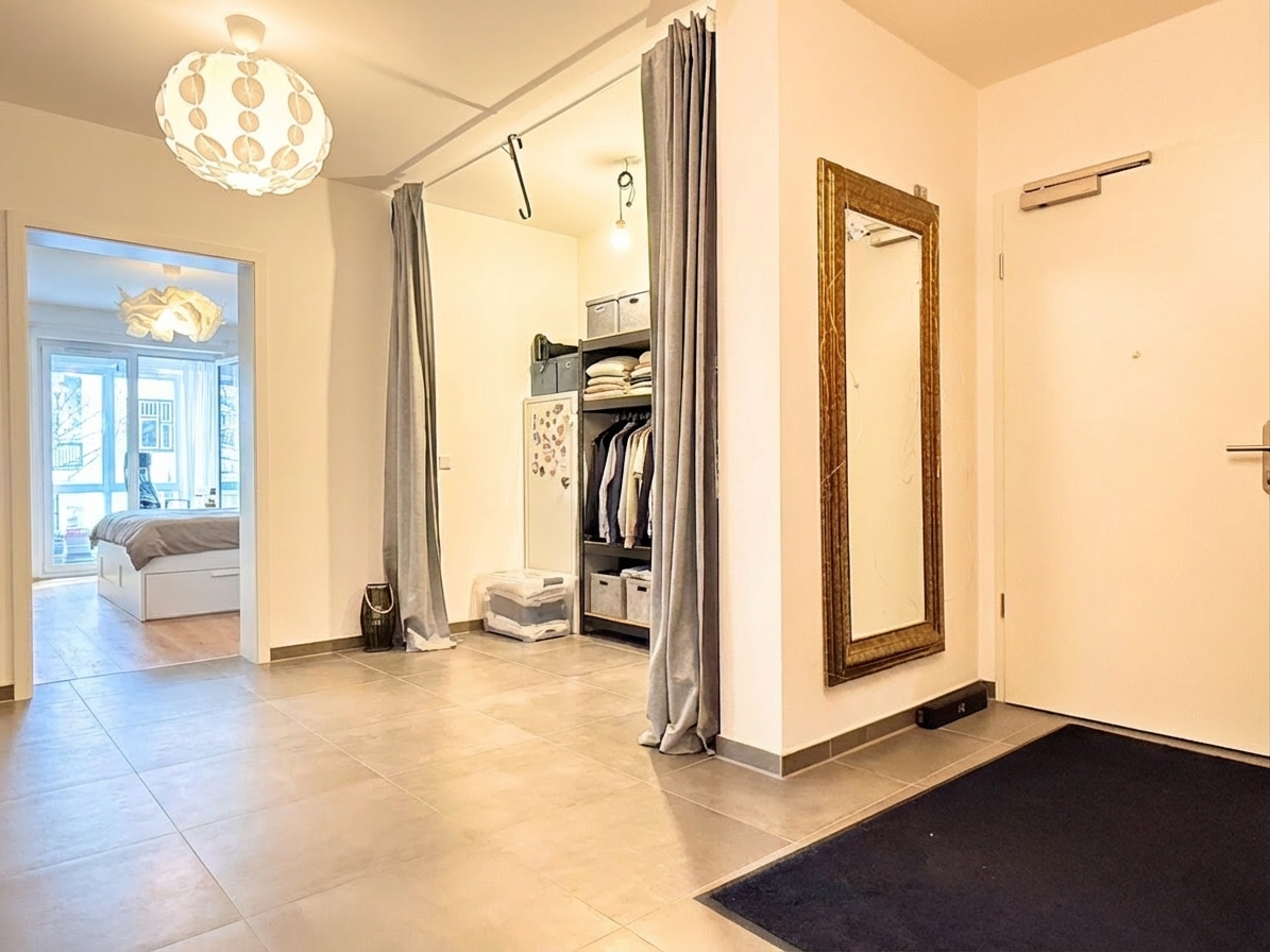 Beim Eintreten empfängt Sie ein großzügiger Eingangsbereich mit einer praktischen Nische, die sich ideal für eine Garderobe oder zusätzlichen Stauraum eignet. Von hier aus sind sämtliche Räume der Wohnung bequem zugänglich.