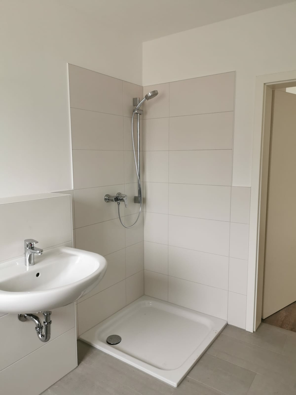 Das Badezimmer inkl. Dusche ist hell gefliest und verfügt zusätzlich über ein Fenster.