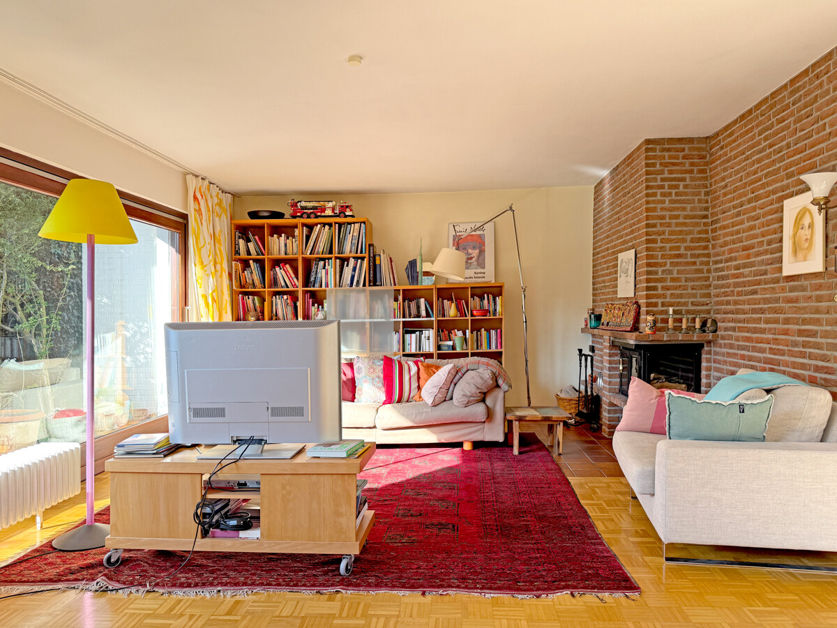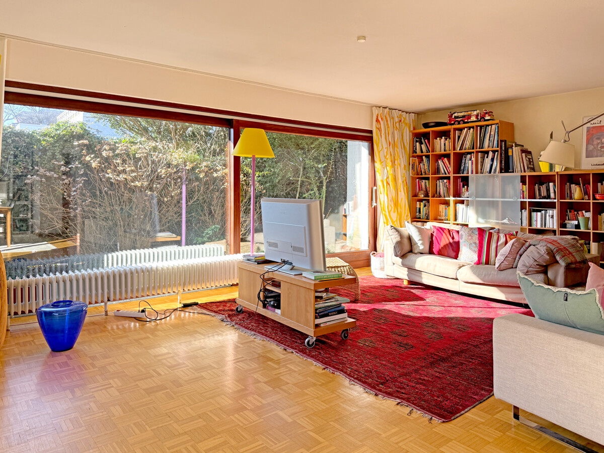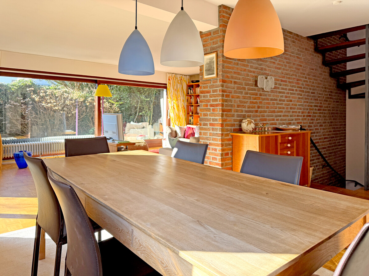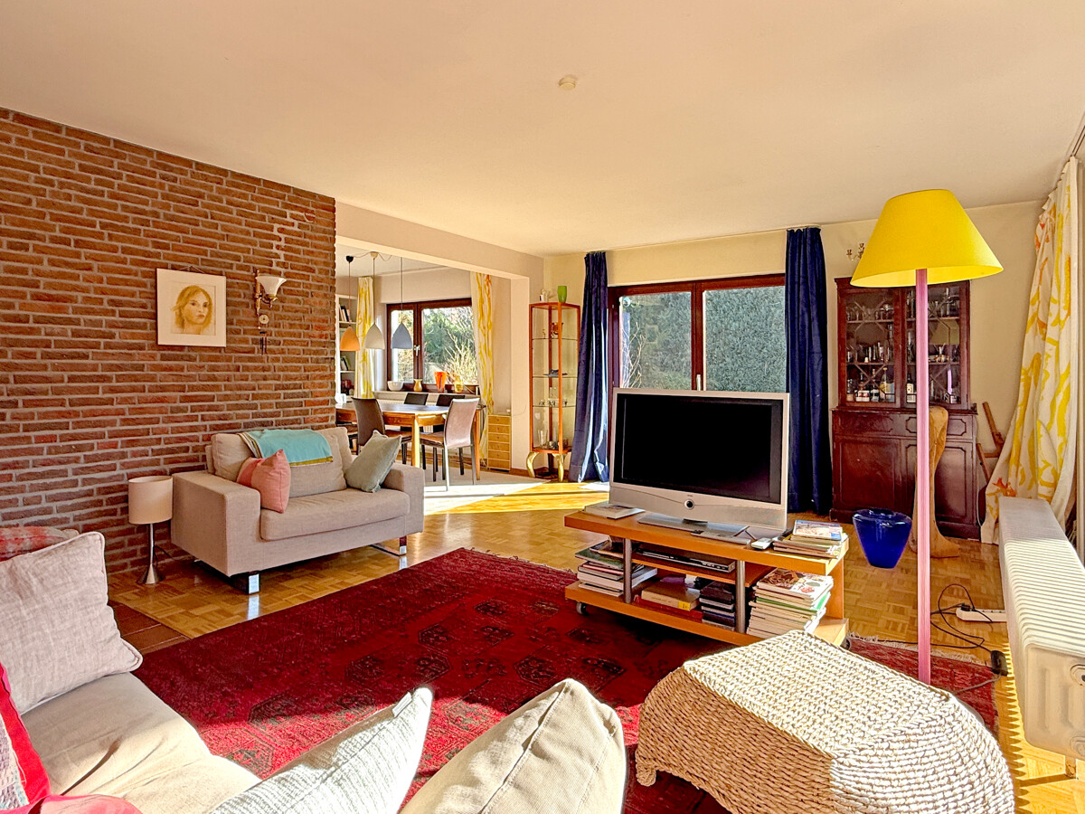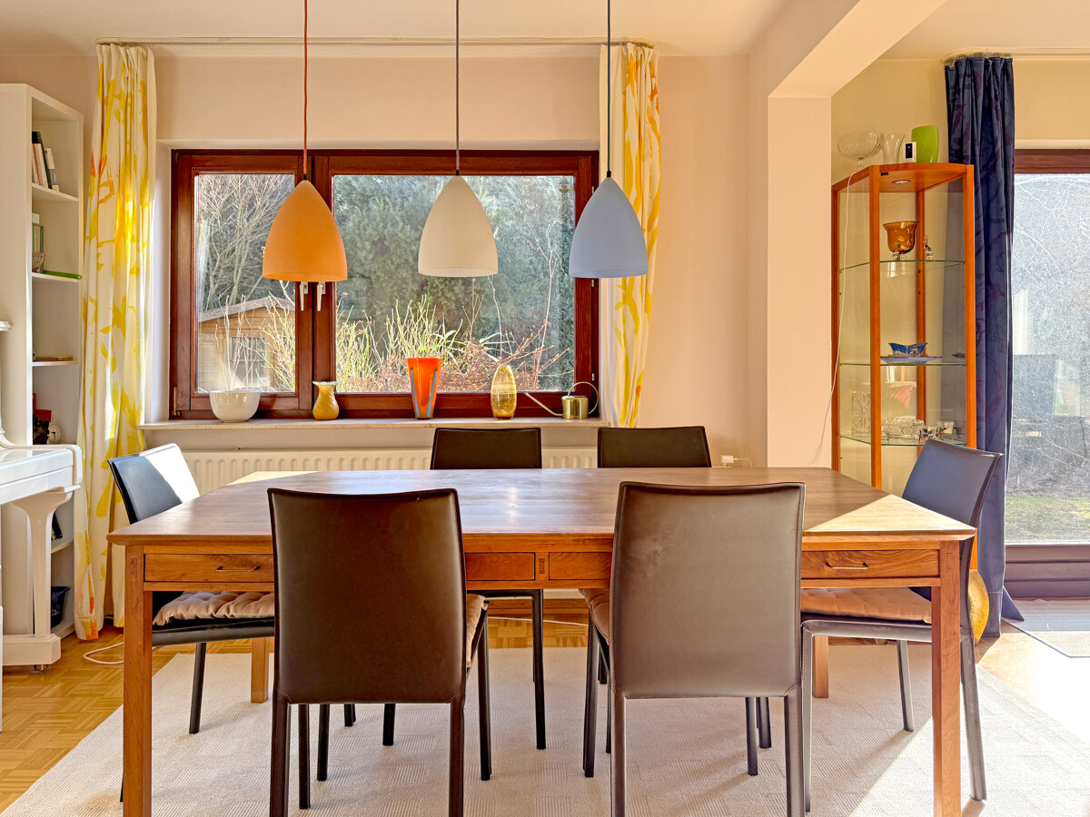 Der Wohn- und Essbereich bilden das Herzstück des Erdgeschosses und öffnen sich mit großen Fensterflächen zum Garten. Es entsteht ein fließender Übergang nach draußen und vermittelt das Gefühl von einer grünen Oase. Die Großzügigkeit der Räume sowie die sonnige Südlage verleihen dem Haus seine einnehmende Atmosphäre. Das Esszimmer liegt hell und kommunikativ im Mittelpunkt, während der Wohnbereich Platz für eine ruhige Sofaecke und flexible Möblierung lässt. Der Kamin, die Mauer aus Ziegeln sowie der Parkettboden schaffen ein gemütliches Ambiente.