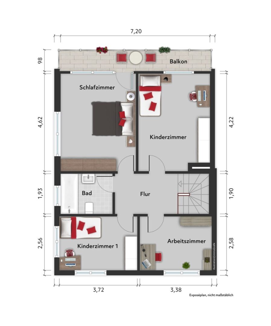 Im Obergeschoss stehen mehrere Zimmer zur Verfügung, die sich als Kinderzimmer, Arbeitszimmer und Schlafzimmer nutzen lassen. Große Fensterflächen schaffen eine freundliche Wirkung, während die Raumgrößen eine klare Aufteilung von Schlafen, Spielen und Lernen ermöglichen. Ein Balkon ergänzt das Raumangebot und bietet einen zusätzlichen, geschützten Außenplatz.