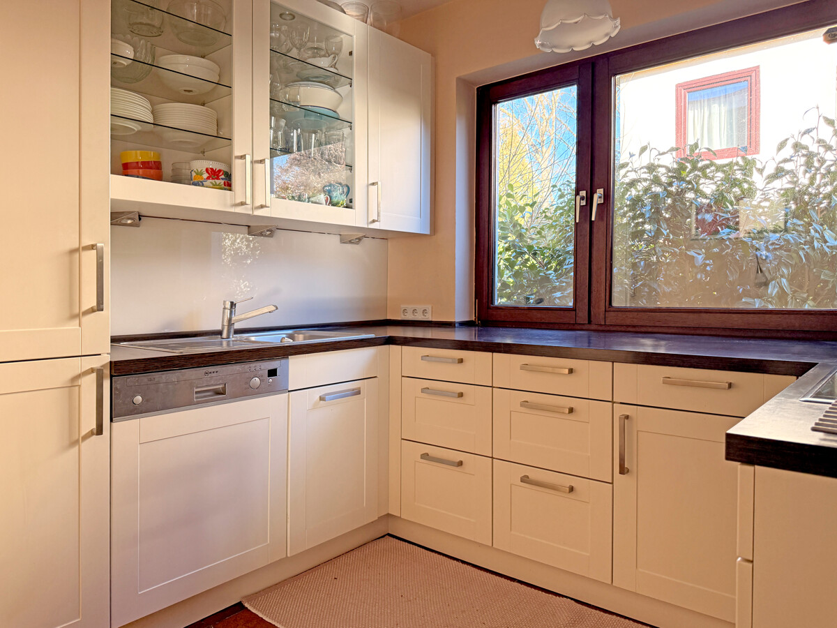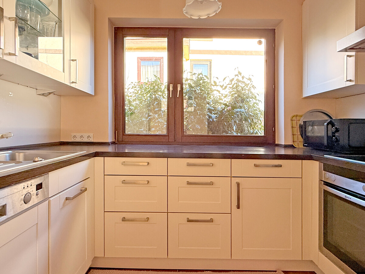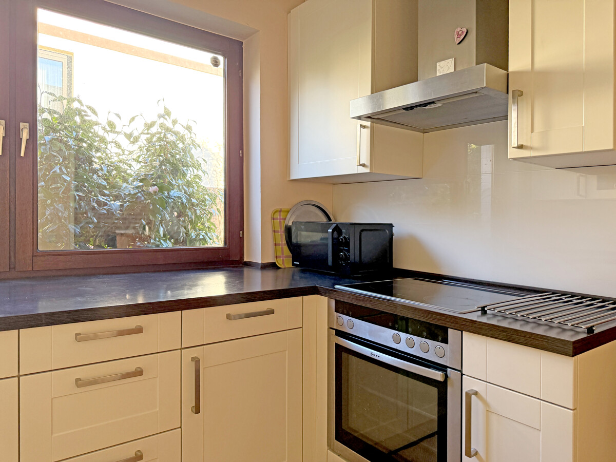 Die Küche ist funktional geschnitten und mit hellen Fronten sowie dunkler Arbeitsfläche modern ausgestattet. Ein Fenster über der Arbeitszone sorgt für Tageslicht und eine angenehme Atmosphäre bei den täglichen Handgriffen.
