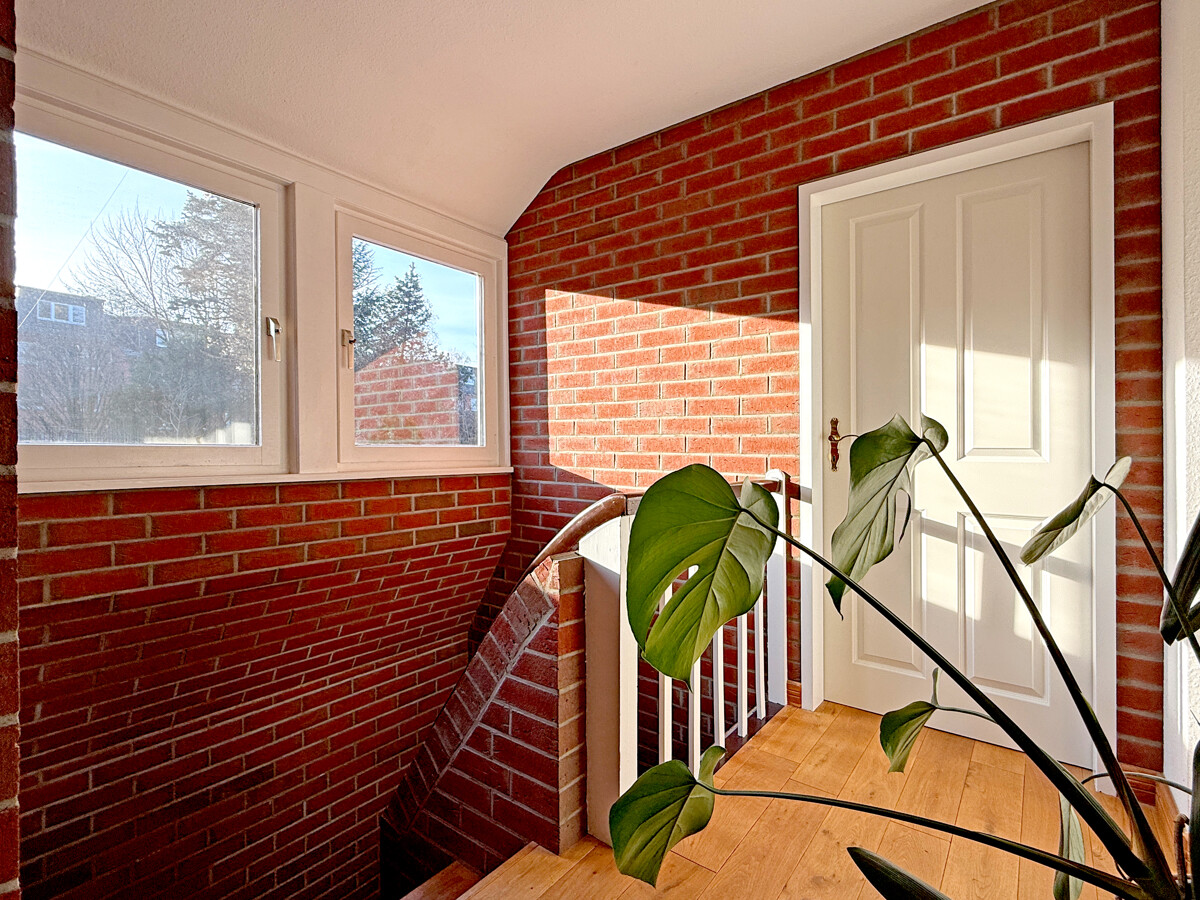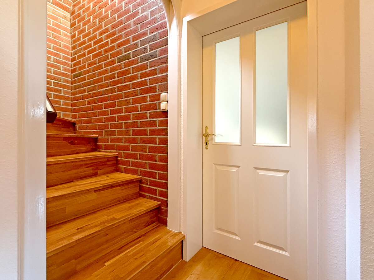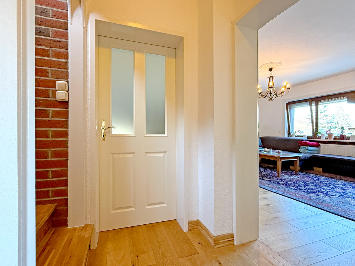 Der Zugang führt in einen hellen Eingangsbereich mit gepflegten Oberflächen und warm wirkendem Holzfußboden, der den Charakter des Hauses sofort spürbar macht. Von hier aus erschließt sich das Erdgeschoss mit kurzen Wegen und einer angenehmen, gut nachvollziehbaren Raumfolge.
